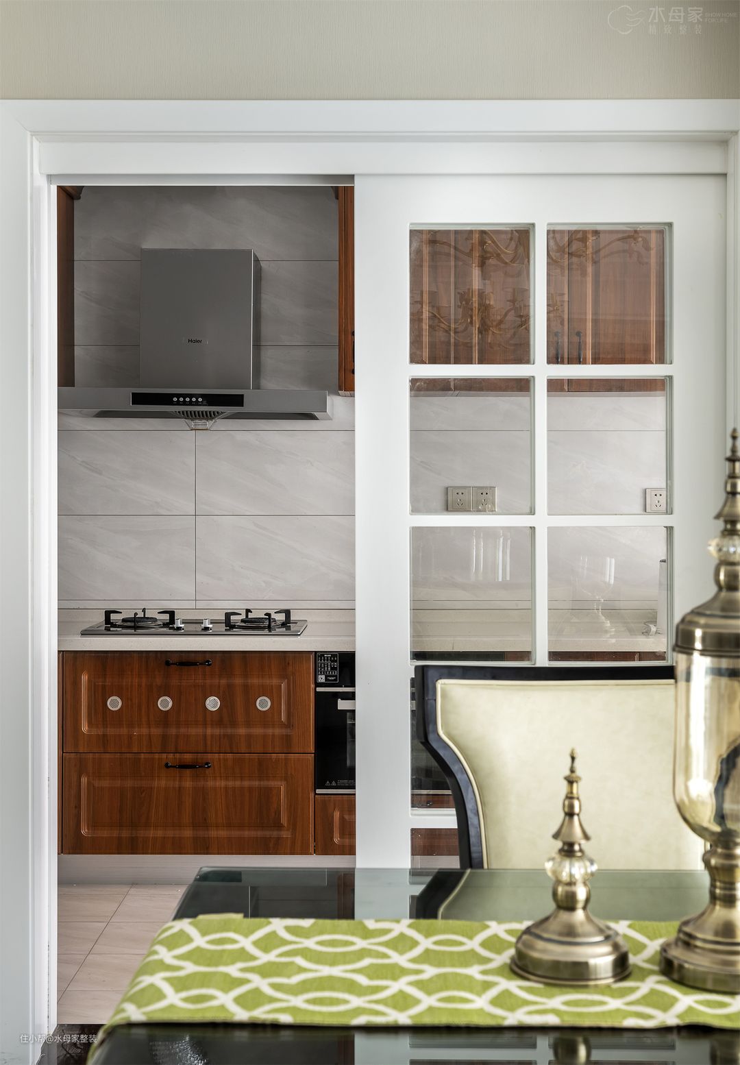 厨房封掉与阳台之间的门,“U”型布置,满足业主对厨房空间的需求,采用欧式风情的木质橱柜,与整体空间风格保持一致。