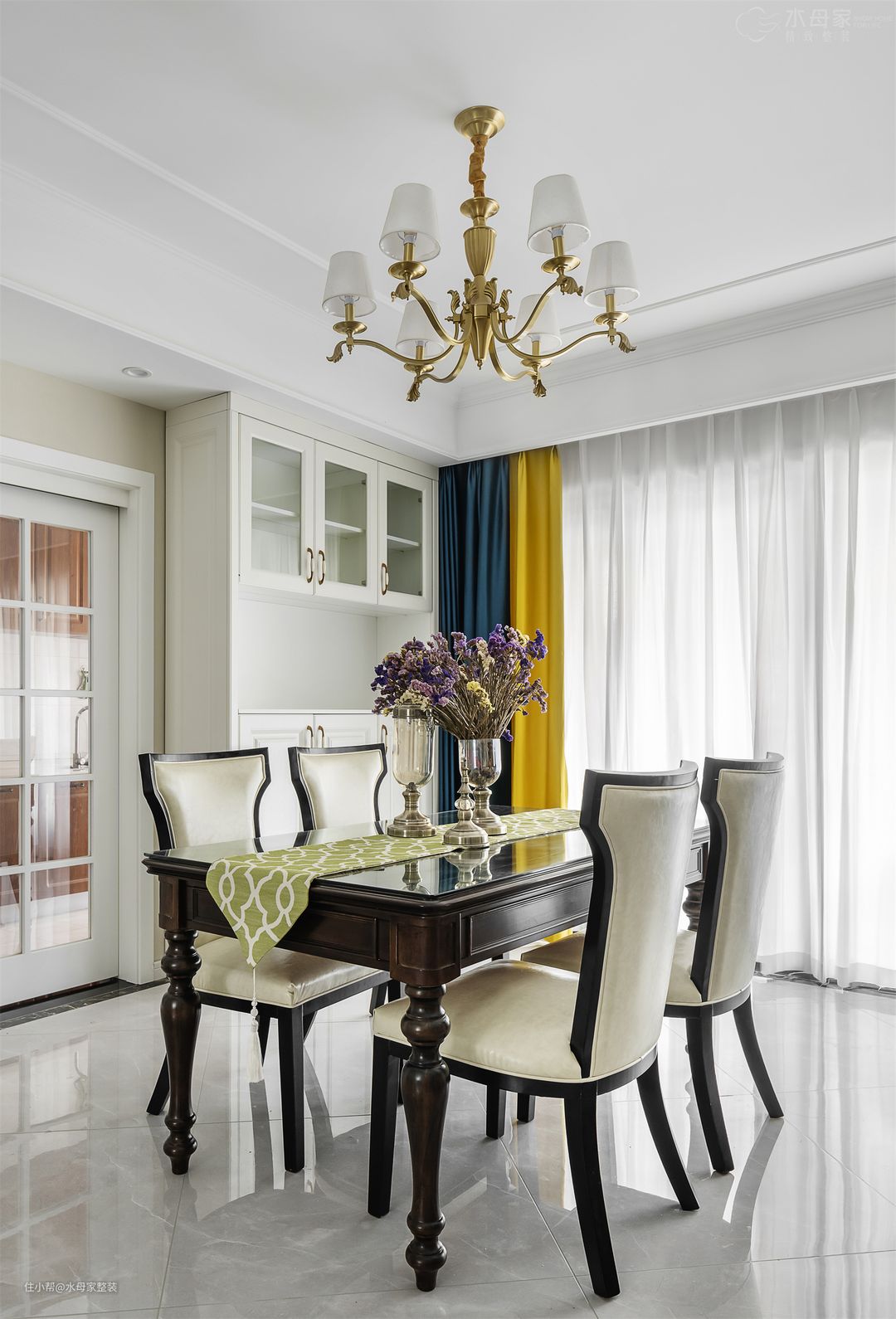 餐客横厅布置,保证一家人很好地交流,阳光从白色纱窗透过来,营造良好的用餐氛围。
