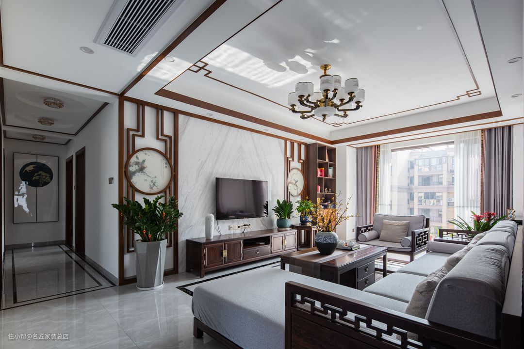 客厅吊顶以木线勾勒吊顶的框线,并以中式的纹样来强调空间的风格。新中式风格的沙发仍然兼顾了舒适性,浅灰色的布艺沙发以中式木框包裹,既有点睛之笔,又具备舒适度。