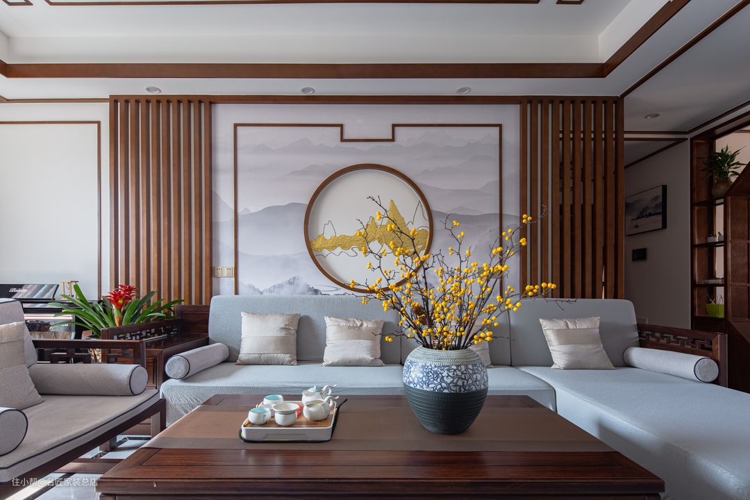 沙发背景墙采用定制中式风格护墙板加木格栅的设计,让居室充满新中式风格的浓郁氛围。云山雾绕的画面平添了东方美学的意韵,圆形的造型嵌入金色的山影画面,增添了明丽之感。