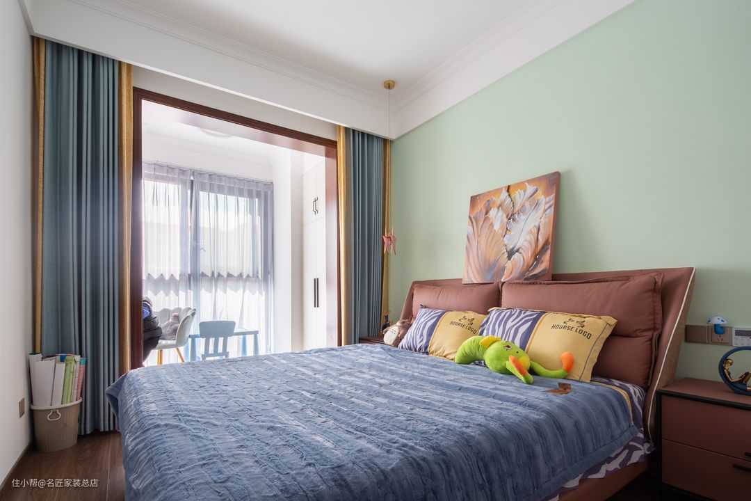 儿童房利用阳台空间在一侧设计出了一处供孩子学习的区域,另一侧则设计成到顶的储物柜,增加了实用性。睡眠空间用淡淡的绿色涂刷,营造出舒适的卧室氛围。