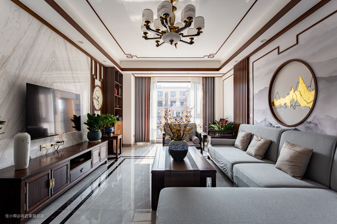 沙发背景墙采用定制中式风格护墙板加木格栅的设计,让居室充满新中式风格的浓郁氛围。云山雾绕的画面平添了东方美学的意韵,圆形的造型嵌入金色的山影画面,增添了明丽之感。