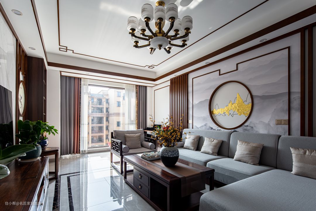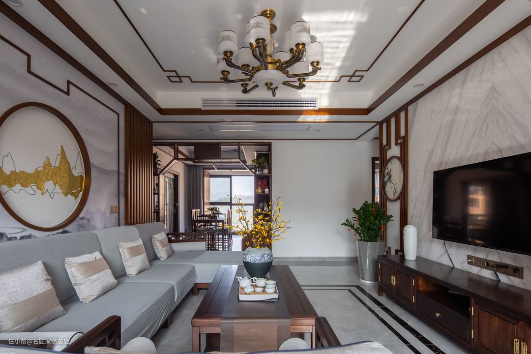 客厅吊顶以木线勾勒吊顶的框线,并以中式的纹样来强调空间的风格。新中式风格的沙发仍然兼顾了舒适性,浅灰色的布艺沙发以中式木框包裹,既有点睛之笔,又具备舒适度。