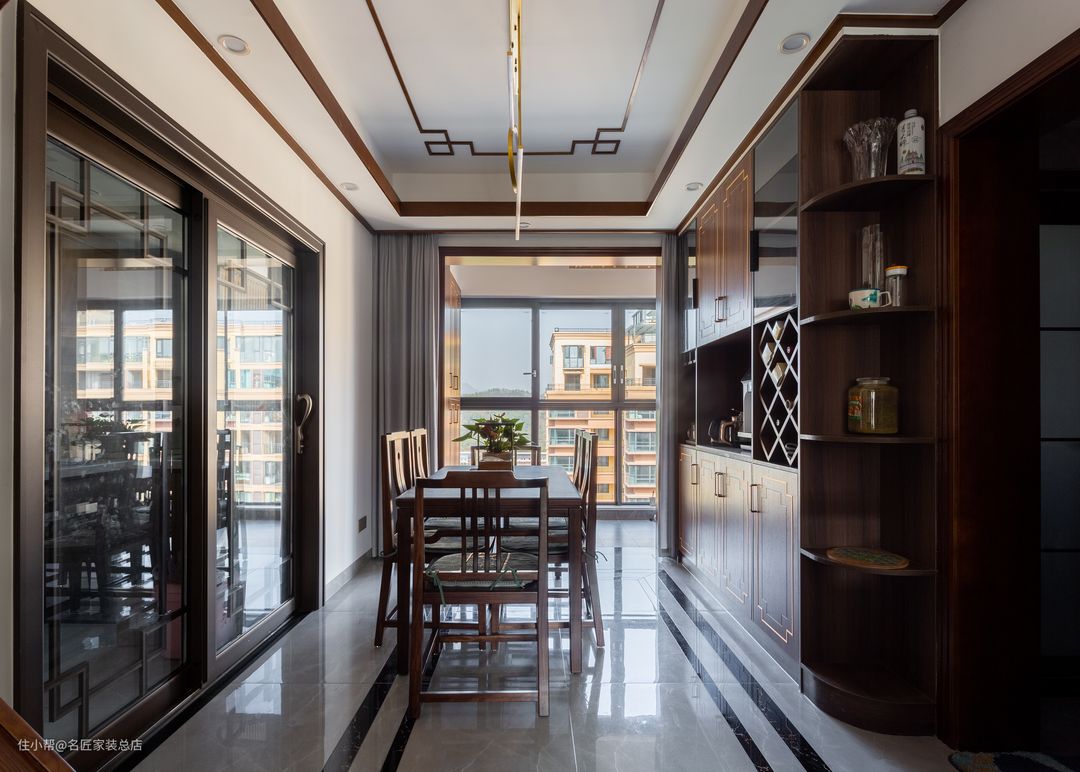 餐厅与生活阳台相连,通光且采光良好,从生活阳台可以眺望远山青翠。餐厨空间包括封闭式厨房,餐厅,以及定制半开放式餐边柜,色调上保持了新中式风格的沉稳,收纳功能也十分强大。