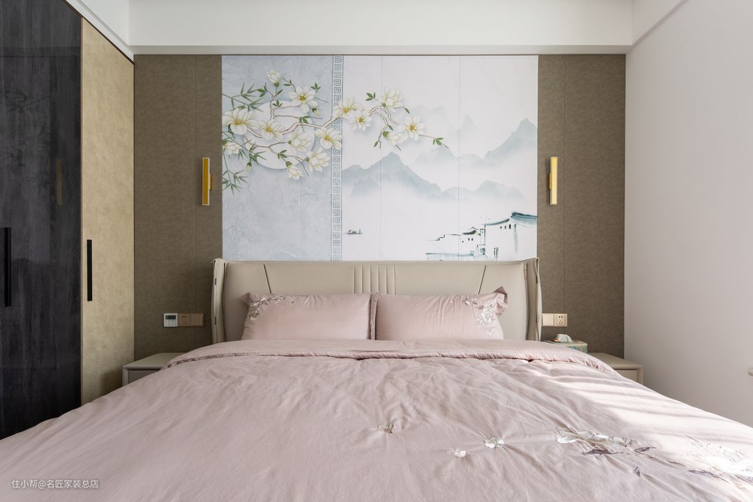 主卧室墙面采用浅咖色硬包与定制画相结合的设计,画面柔美静谧,与米色的软靠大床映衬,营造出一个舒适宁静的睡眠空间。