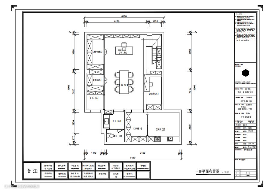 负一层平面设计图 【设计亮点】 ①改善地下室布局,设计为同时兼书房、会客、水吧台、用餐等功能为一体的多功能空间 ②用木饰面做墙体装饰,调整大户型的空间质感,避免了大白墙带来的清冷单调。 ③客餐厅等公区多处使用线性灯带,营造设计感和温馨的氛围。
