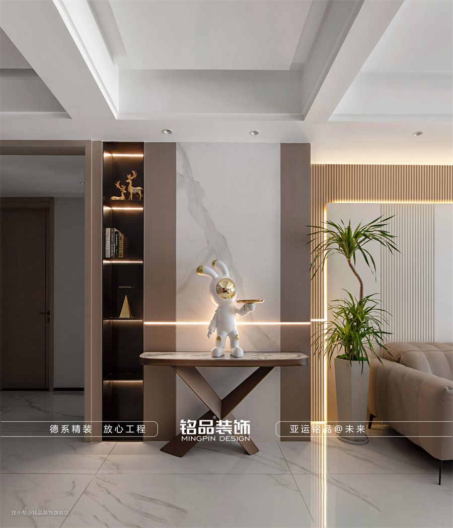 入户正对玄关柜,选用原木和大理石相结合,简洁大气。开放式的玄关柜格内置灯带,无论是展示收藏或是摆放书籍, 都极具质感。