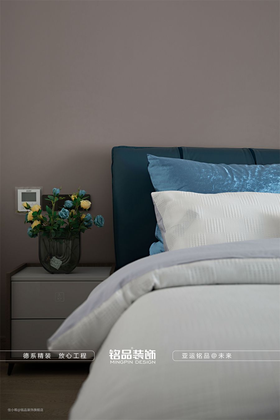 卧室整体色调清浅平和,背景墙涂刷了灰色乳胶漆,营造静谧舒适的起居环境。一侧是隐形门的通顶衣柜,保证空间完整性的同时又能有超大的收纳容量。