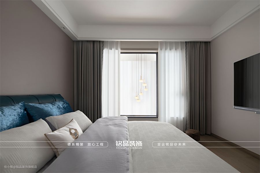 主卧飘窗起到拉住两侧承重墙的作用,因此无法做拆除或其他改动。设计师用轻纱帘和现代艺术灯饰来对飘窗进行了妆点,避免太过单调。