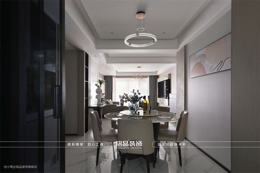 木饰面作为脉络,联通着餐厅——玄关——客厅,让整体风格统一和谐。