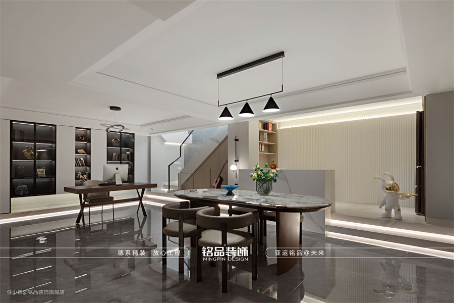 再过来岩板桌和现代风格创意椅的组合,与旁边地阶上的水吧台、酒柜一起,形成了一个以茶会友、翻书闲读的场所,惬意轻松。