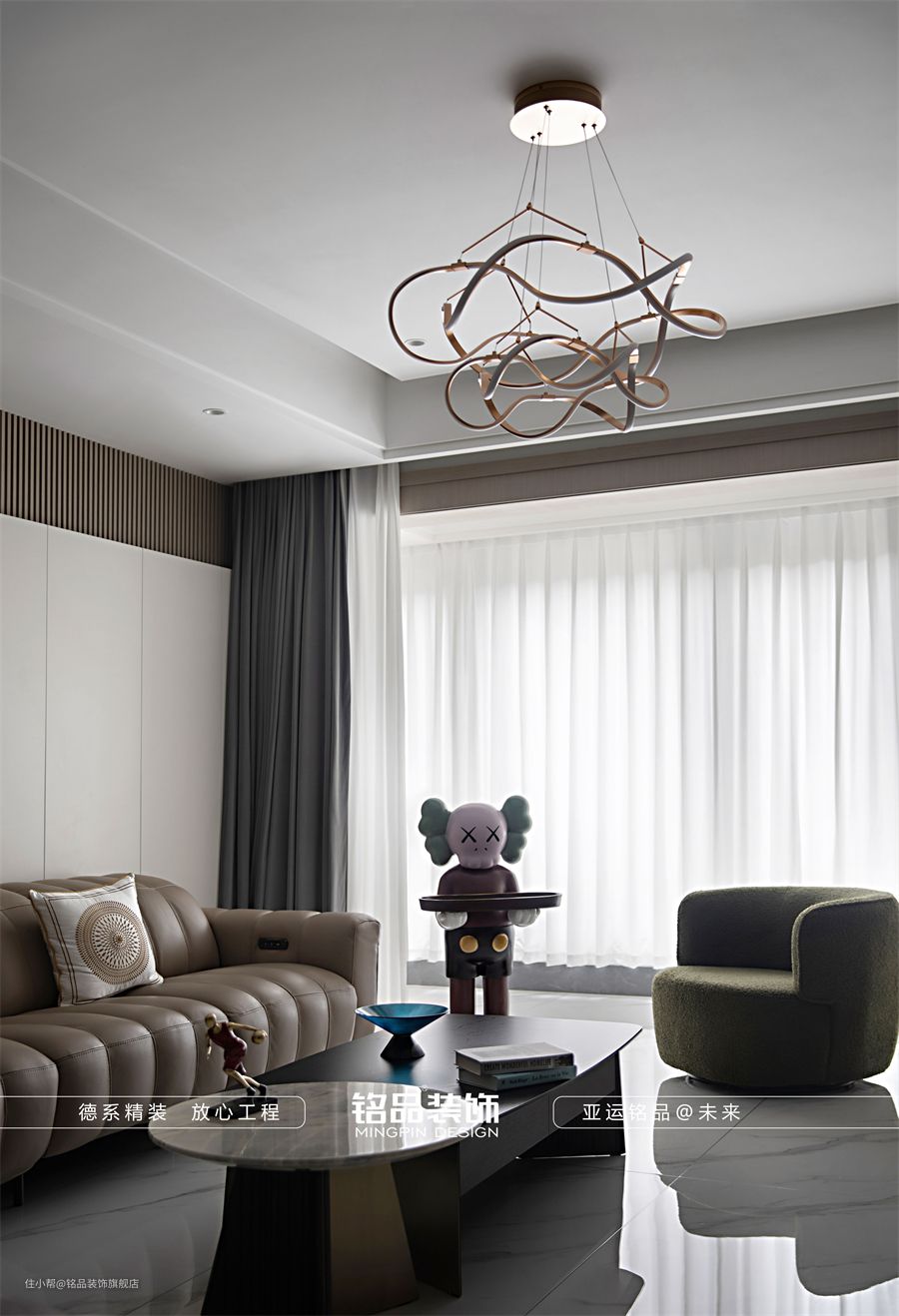 灯饰选用轻奢风格锌合金创意吊灯,既能拥有吊灯的奢华、优雅质感,又不会如同传统的水晶吊灯一样笨重呆滞,显得轻盈富有时尚感与设计感。