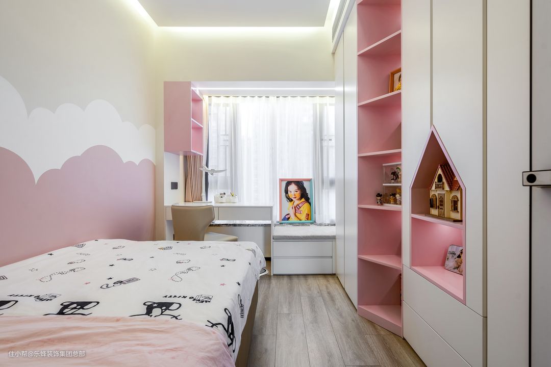 同为粉色系房间,因为没有大面积渲染,也没有运用高饱和配色,整个房间透露着的俏皮和活泼不可忽视。 依靠飘窗设计了孩子的书桌和休闲区,与收纳柜连为一体,动线规划得富余精简。