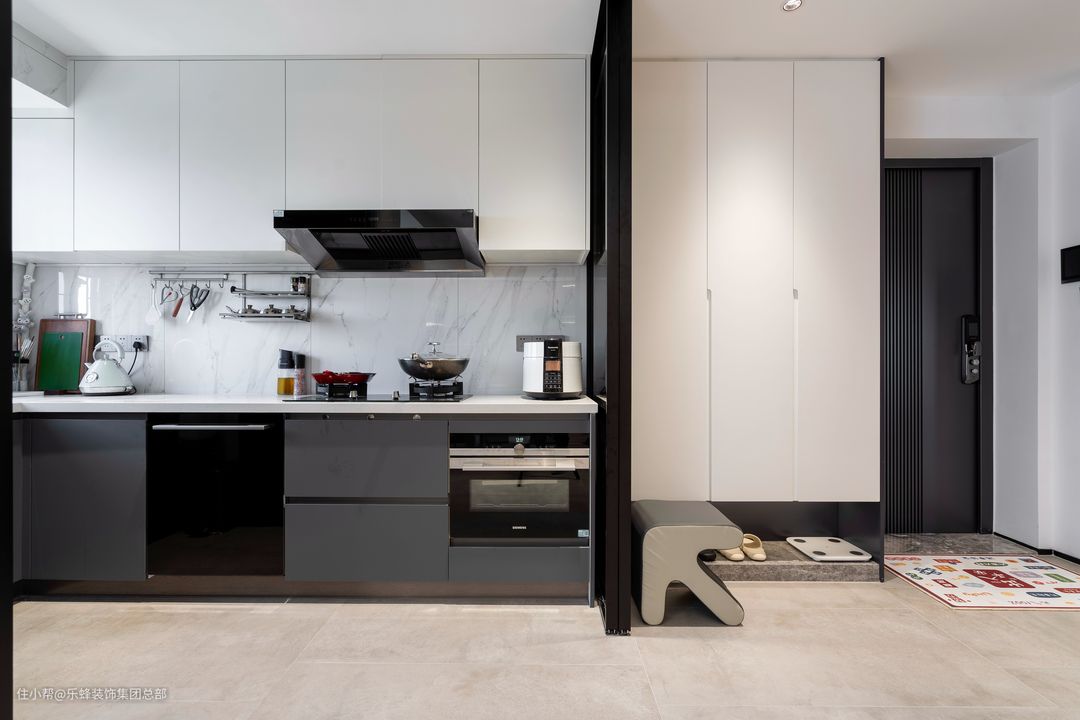 黑白配色的半开放式设计,室外的自然采光和室内绚丽的灯光都能同时作用于它。玻璃推拉门隐藏在两侧,最大程度保证打开时的开阔和通透。推拉门选择吊轨的形式,地面无轨道,不会形成卫生死角,孩子也不会在经过厨房时绊倒。安全、可靠的不止是父母,家中更应如此。