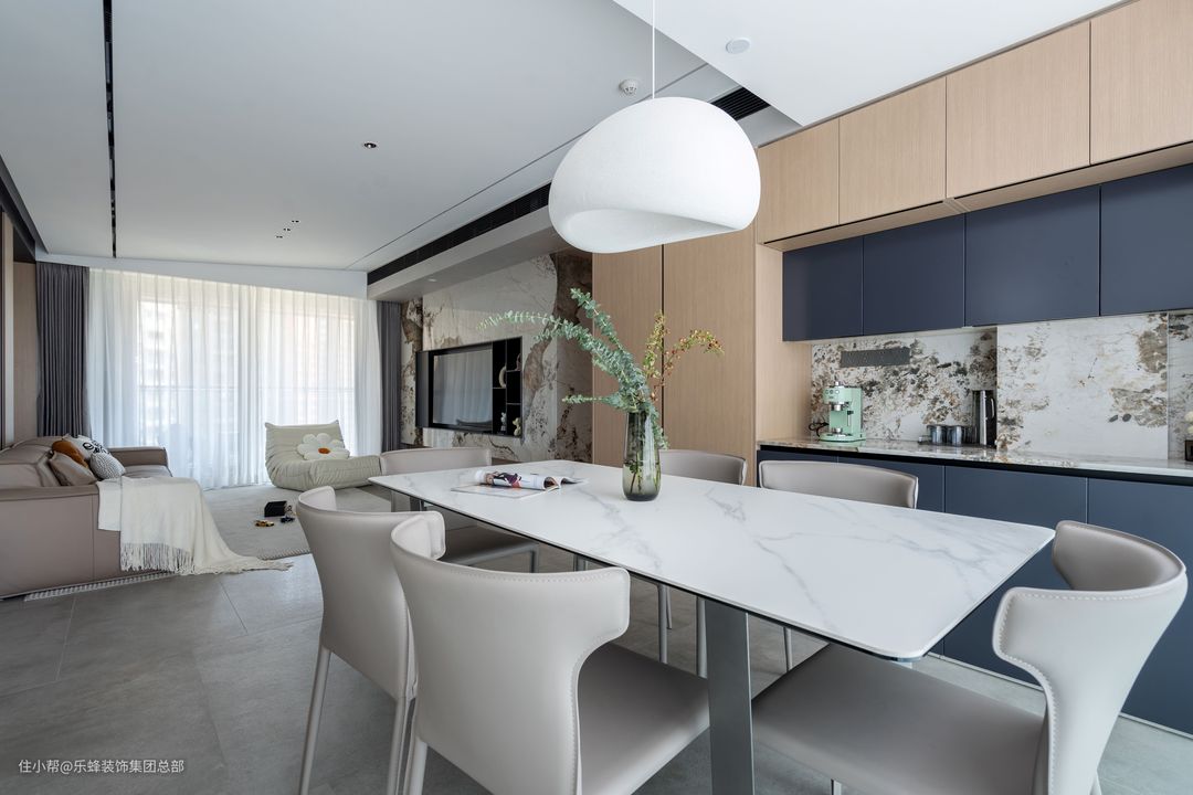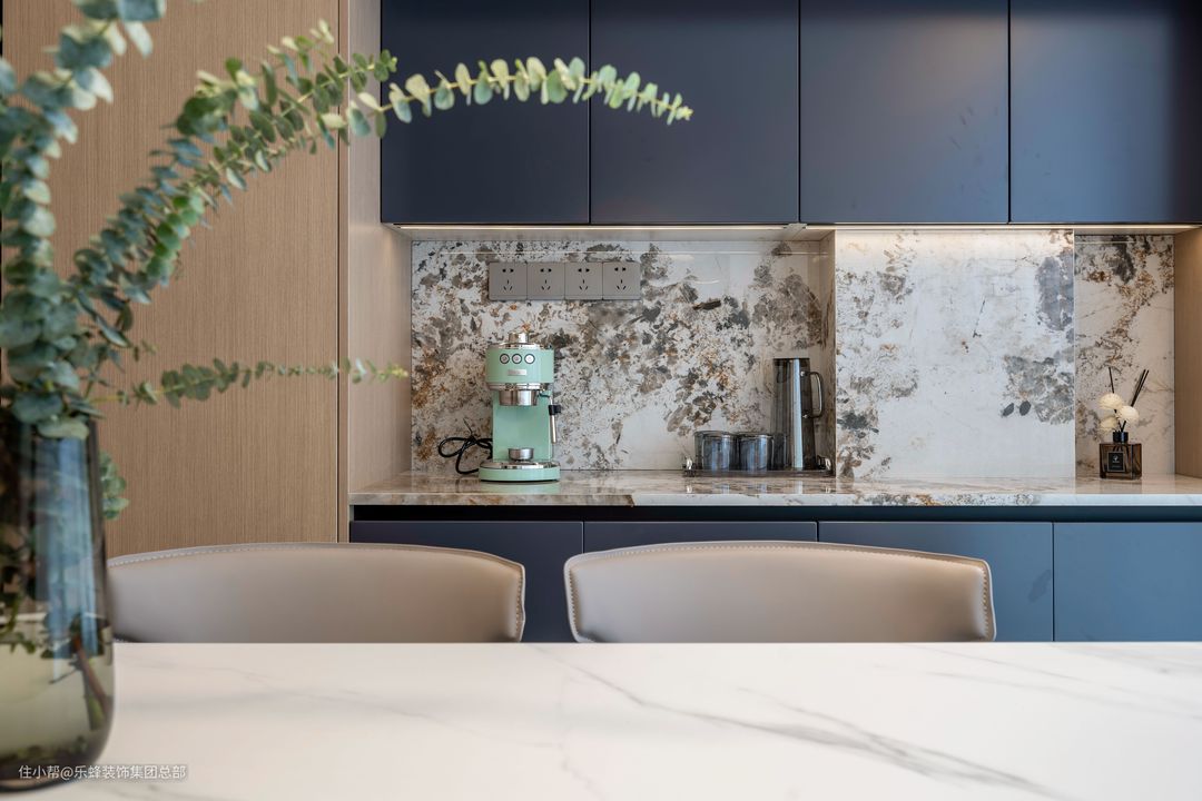 藏青、原木、泼墨状岩板,不是甜得发腻的配色,是清淡且回味悠长。岩板防水防霉耐磨的优秀性能,作为水吧的操作台面和背板再合适不过。