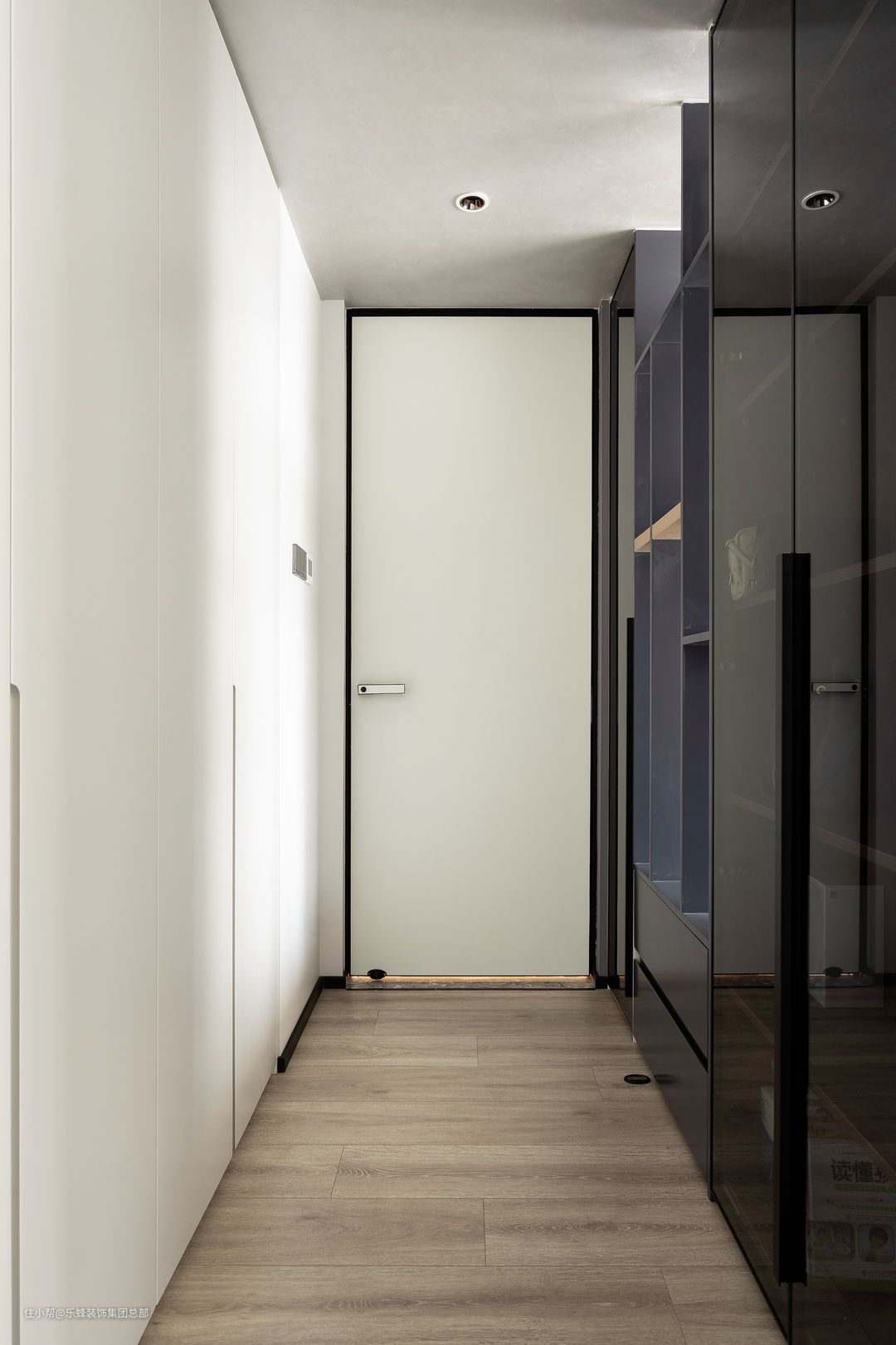 进入主卧的过道也能成为精致衣帽间,由床头衣柜和重建的凹面墙体嵌入式衣柜构成,一边是玻璃柜门用于精致包包的展示,一边用于存放常穿的衣物,入室就能换上舒适家居服,生活的美妙就是由这些点滴构成。 值得一提的是,房门也进行了延伸门洞的设计,极简黑白,和室内风格有更好的融合。