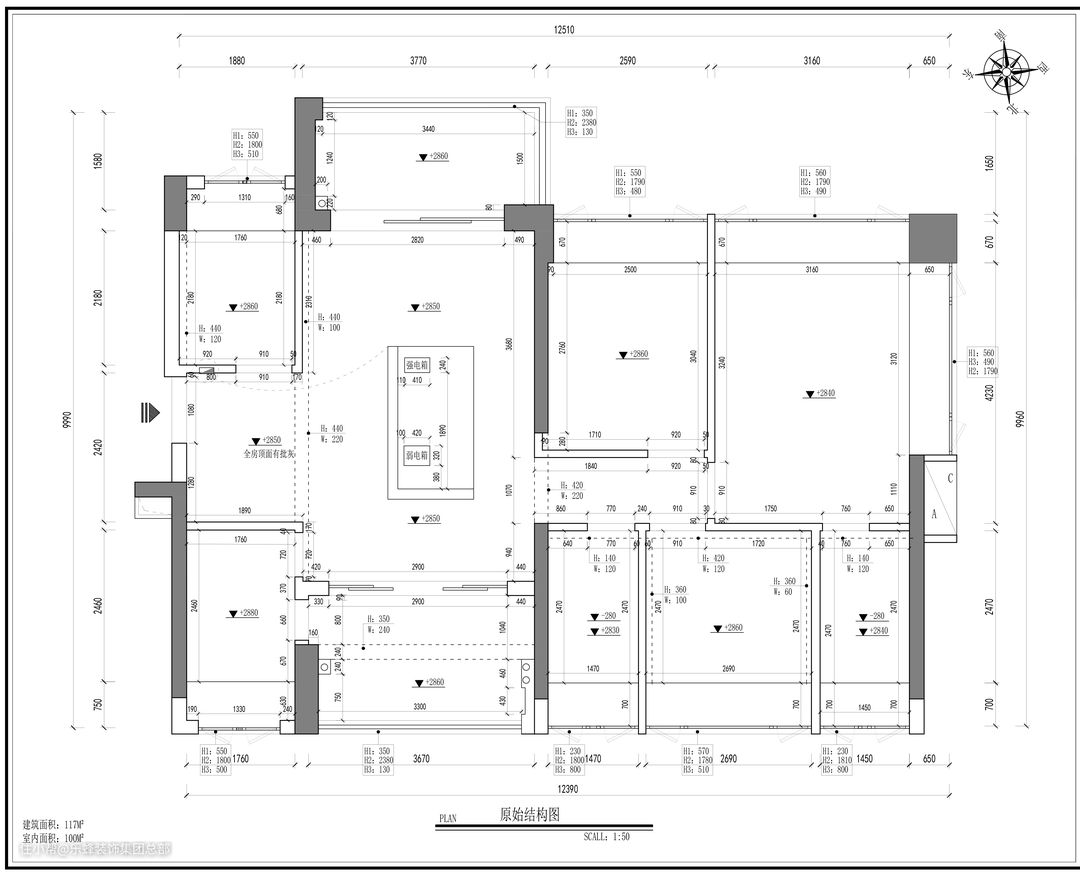 原始户型: ①入户左侧的房间面积比较小,可以用来做入户门厅,但是入口较窄,,使入户的视野比较拥挤。 ②餐厅、厨房、阳台的格局分布不均,空间分布不合理,餐厅使用面积很小,餐厅外阳台过大,厨房门也很小。 ③主卧需要拥有充足的收纳,目前格局还不能全完满足,飘窗面积挺大,最好加以利用。