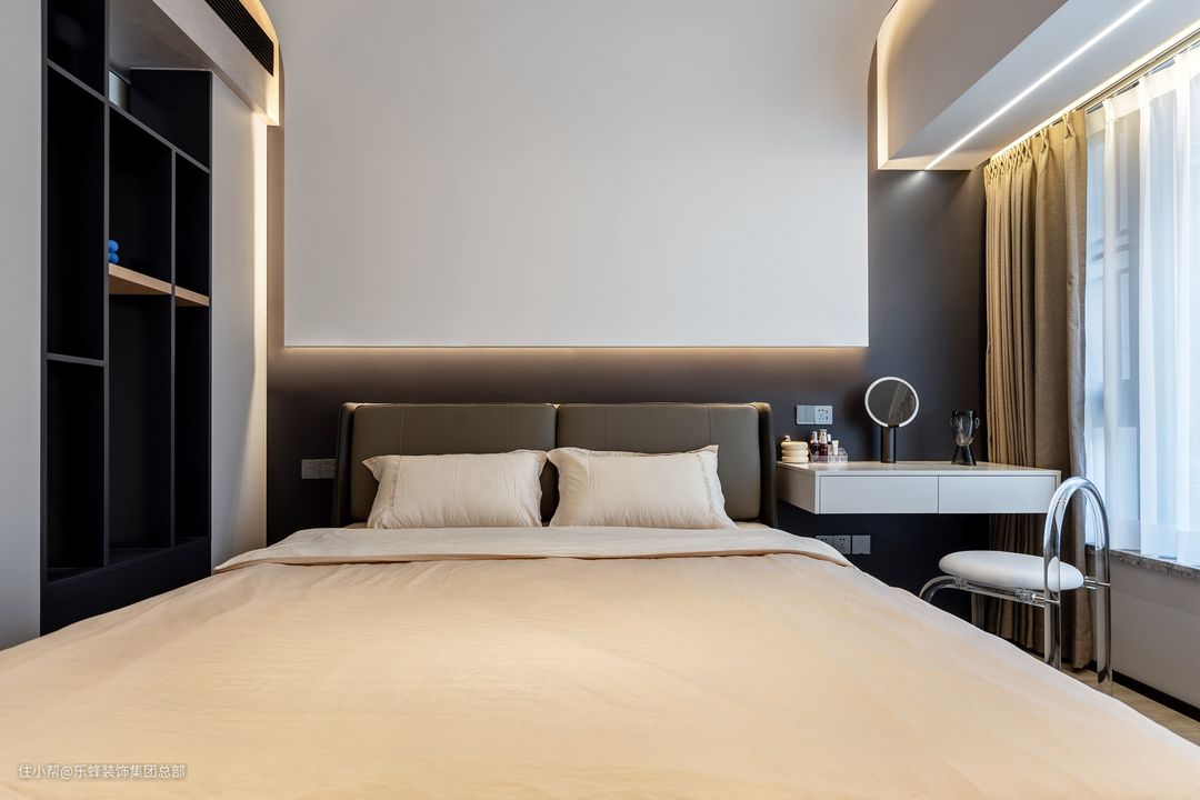 没有什么比将平面变得立体更直白惊艳的表达,主卧的设计中没有添加过多摆设性的装饰,而是将设计依托于格局,在制作吊顶时,将吊顶和墙面衔接,空间也因此无比顺畅丝滑。