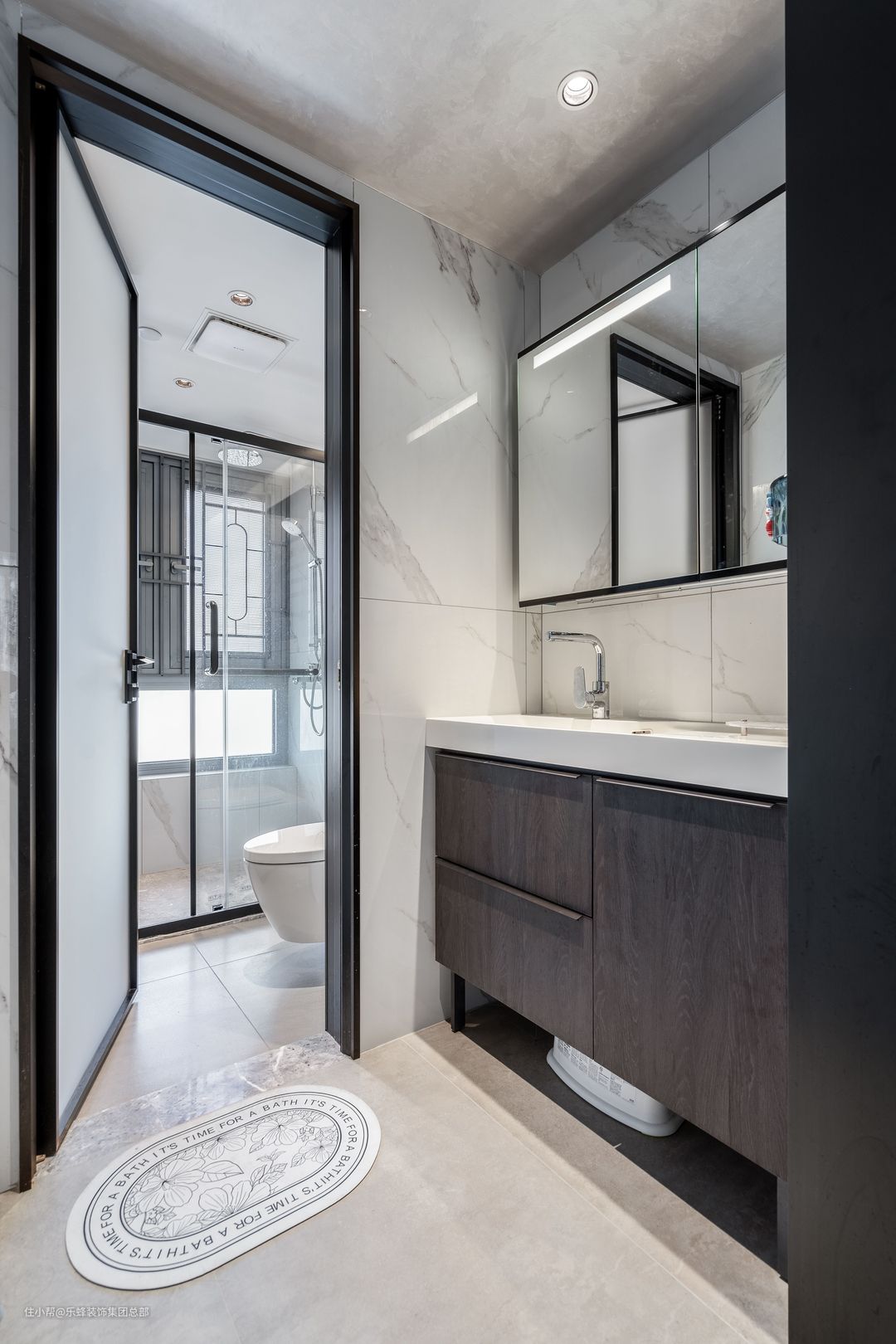 内侧干湿分离,马桶为挂壁式马桶,最大程度不留卫生死角,保持卫生间卫生整洁。淋浴区利用泼墨纹理的糙面大理石作为防滑石,安全照顾到角角落落。