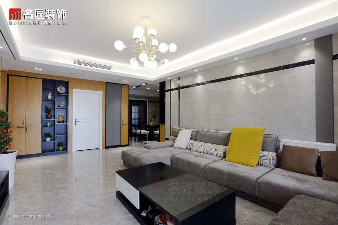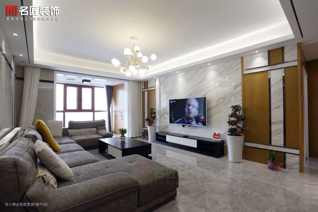 沙发背景大面积大理石铺贴 深灰色波导线条上墙 线与面勾画出简洁明快的氛围 宽敞的室内空间 给居住者自如的生活动线