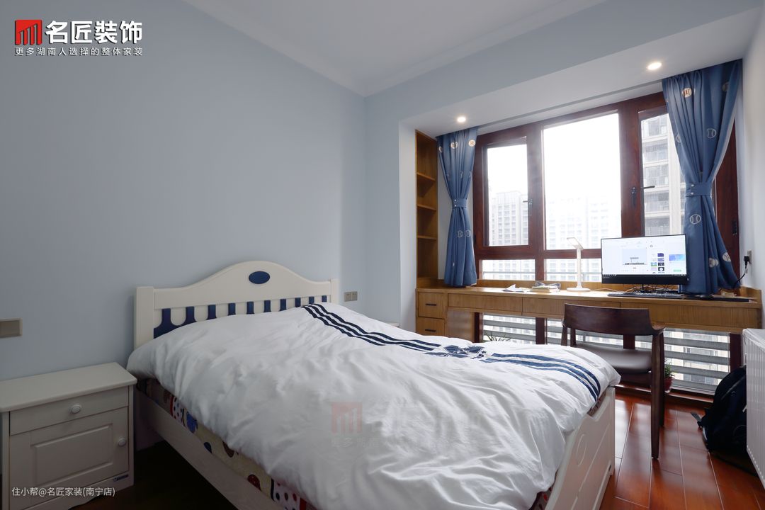 淡淡的蓝色墙面 烘托出室内宁静的氛围 靠窗设计出书柜书柜 利用空间 让学习区域明亮舒适 让孩子有更好的居住体验