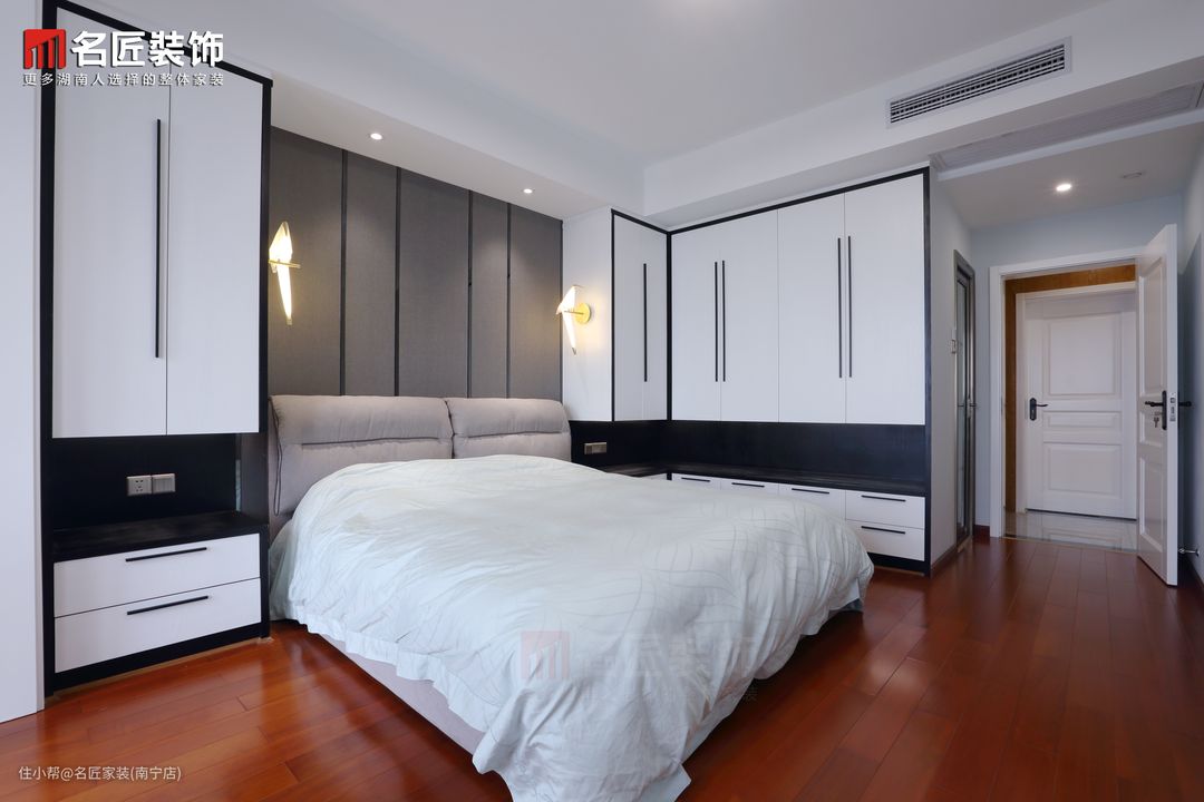 空间以黑白灰为主色调 强大的收纳功能让居室充满生活气息 利落简明的线条 勾画出时尚摩登的空间感 舒适的软靠大窗与墙面硬包相结合 彰显高级感的生活品质