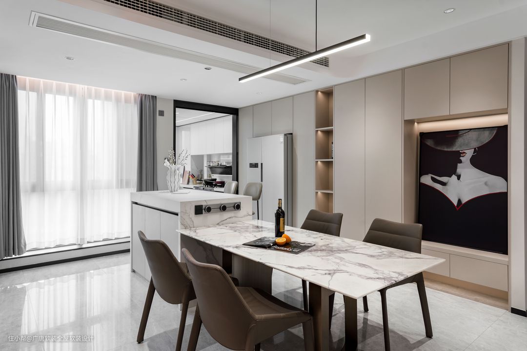 中岛结合餐桌,并设置排插电源,可用餐、午茶、小聚、学习、工作,让功能性、仪式感都得以彰显。
