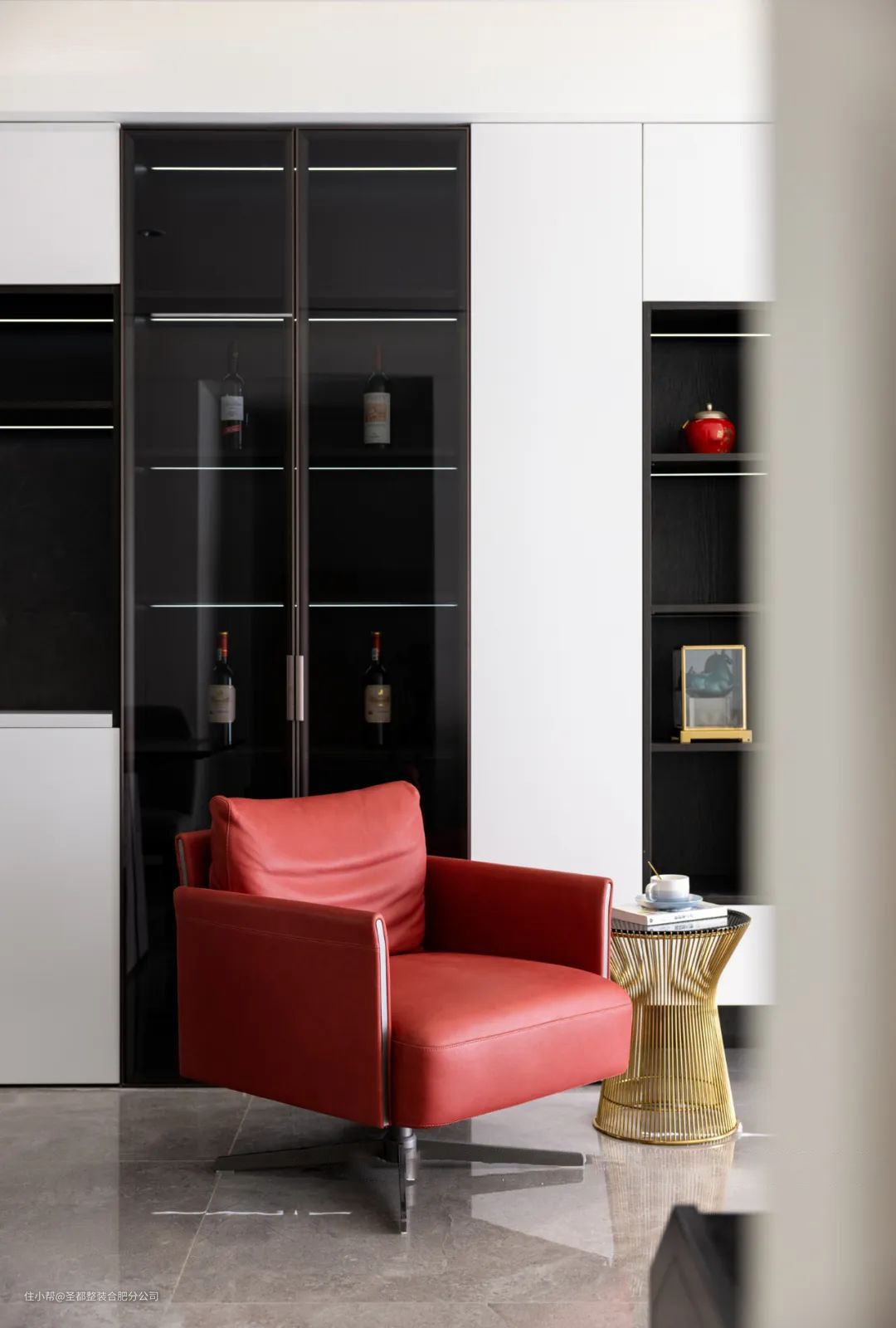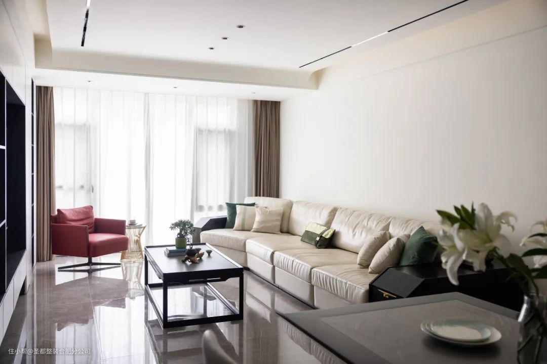单色的维持,流露于轮廓,间杂在晨曦的薄薄日光,是米白色异形沙发的克制,是红色单人沙发的热烈。