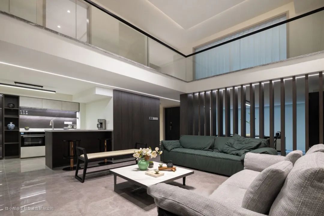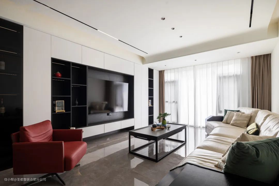 客厅采用悬浮顶式照明,主要依靠灯带反光折射照明,让空间被打亮,也让光变得更温柔。电视背景墙保留黑与白的纯粹,注重分层、材质、空间收纳。