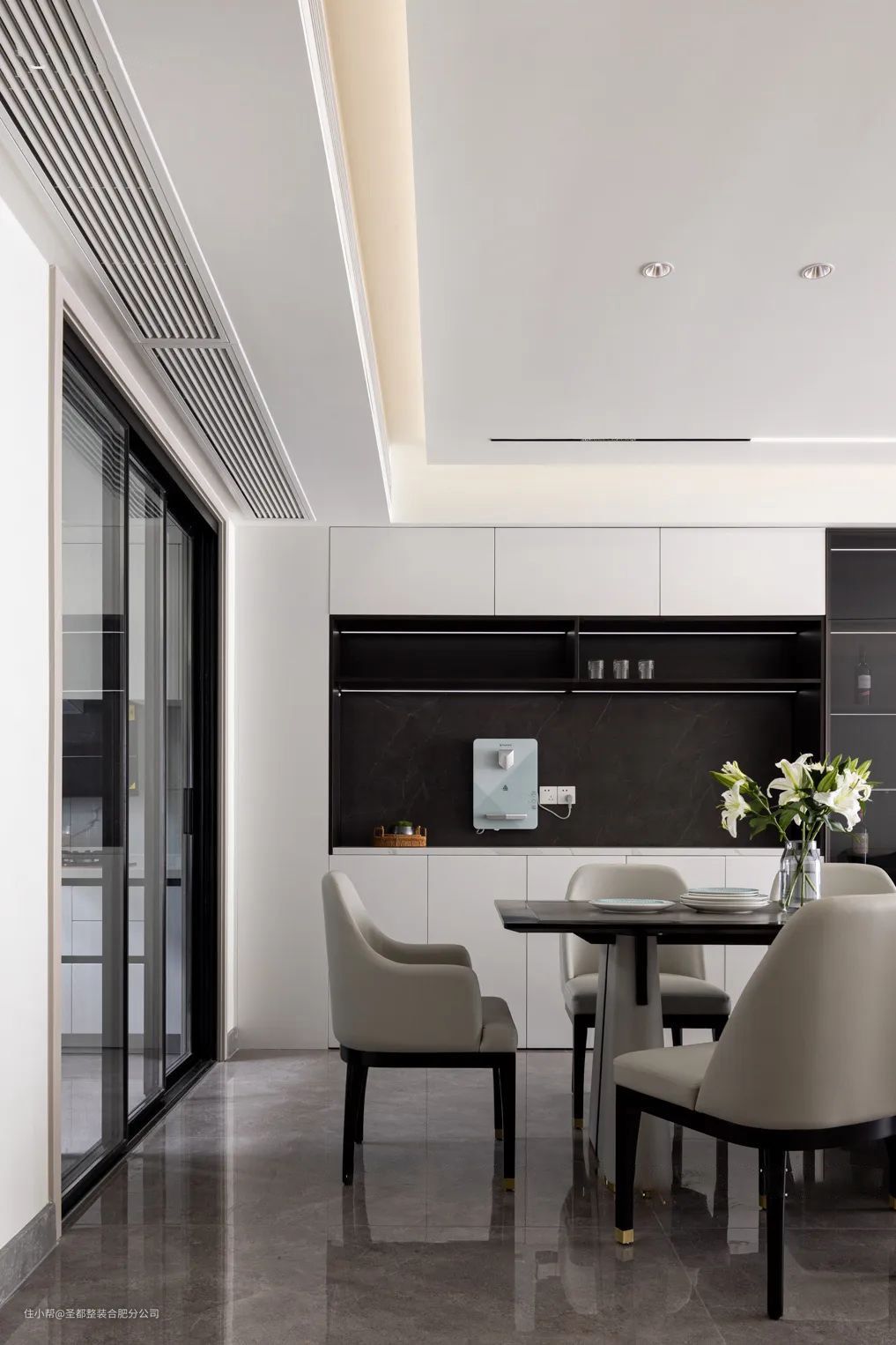 沿着餐厅一侧墙面做顶天立地收纳柜,中间留空部分可以随手置放物品,放上咖啡机或直饮机可以当作水吧台使用。
