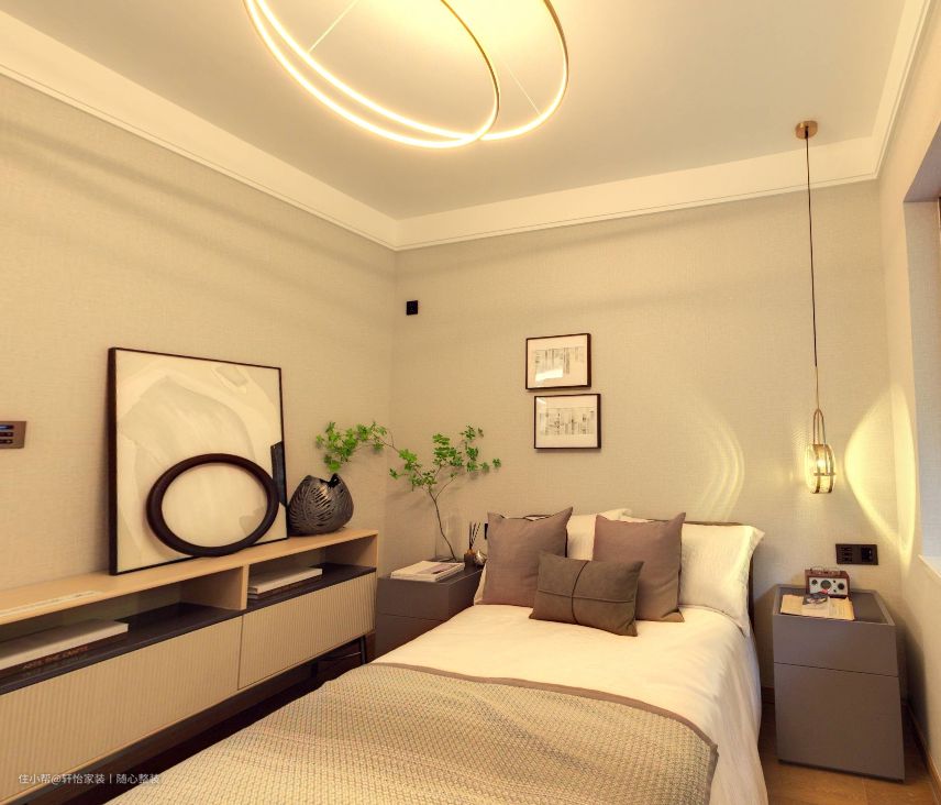 客房的设计上整体显现简约但不失奢华,房间的天花吊灯以具线条感的圆形设计布局,侧边还搭配一盏长长的垂吊的吊灯,光线上以暖光灯照耀,整房显温馨。而房间墙体上做简单的壁画点缀,搭配盆栽绿植,大气且得体。