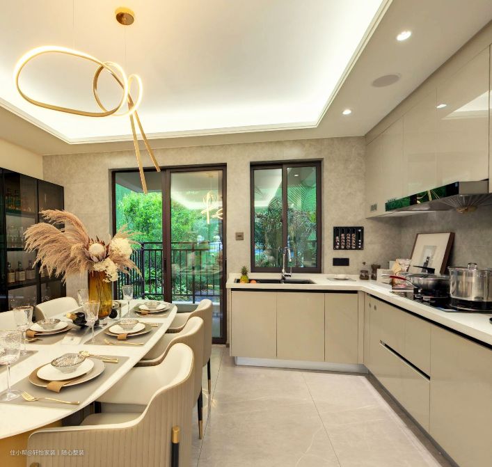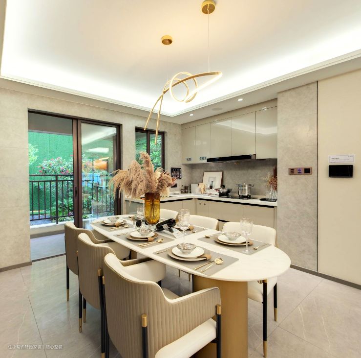 厨房的装修显阔绰、奢华。地面以洁净的灰色调瓷砖进行铺设,整体显明亮、通透。餐厅天花以颇具线条感的简约灯光点缀,而餐桌的选择上则是采用了椭圆形的布局,桌面呈大理石纹, 加以西式餐具摆盘,整体显大方奢华;