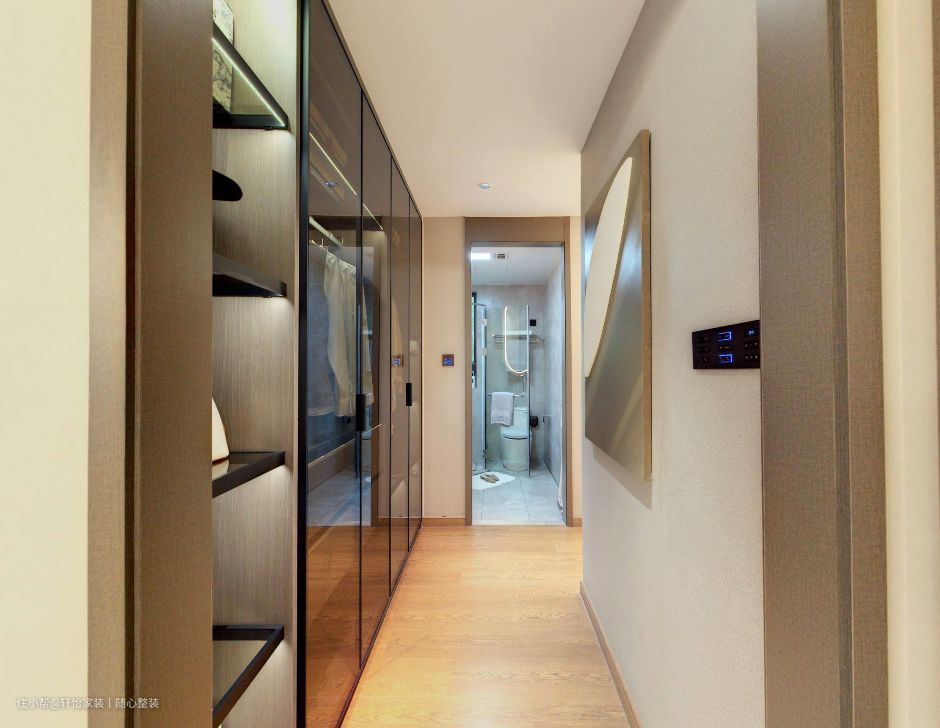 在房间通往卫生间的过道上则是巧妙的利用了过道的空间,布局了一个开放式的衣帽间。衣帽柜做入墙式的设计,在一定程度上节省了不少的空间。整柜以经典高贵的黑色镶边,以透明的玻璃做外封,柜子里侧分好些隔层,整柜容量非常大,能轻松收纳各式衣帽鞋帽。