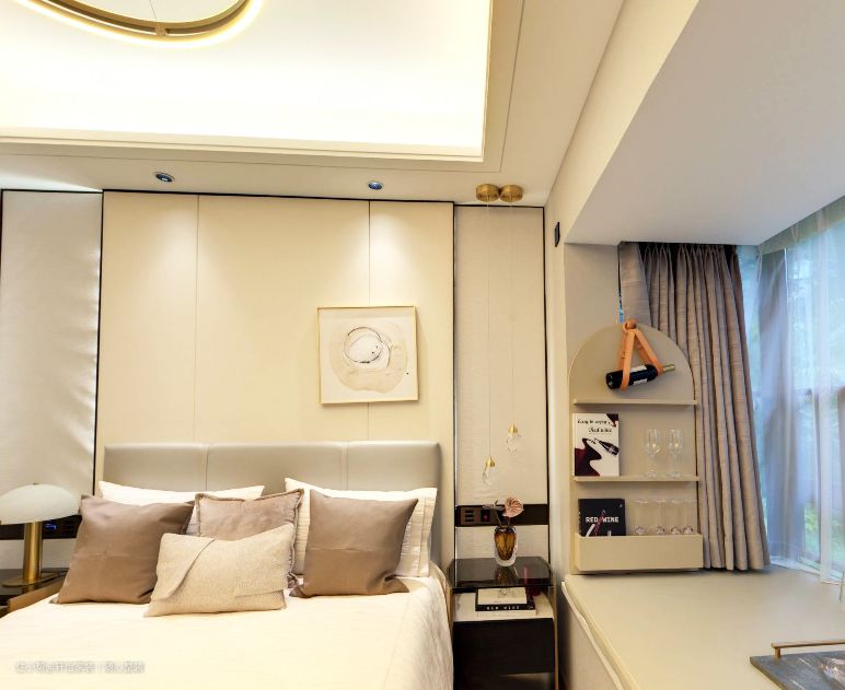 房间最里侧是飘窗的位置,窗台上以软榻的毯子进行铺设,左右两侧置简单的置物柜,可简单放置一些零碎物品,床头一侧的背景墙上以简约的壁画进行点缀,在奢华的天花吊灯的照耀下,显更加的精致;