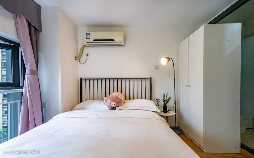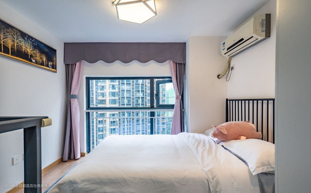 上层空间做的卧室的设计,没有安装吊灯,而是吸顶灯与采用的局部灯光进行照明,也可以很好的保障室内的照明,一侧的柜子增加空间的收纳空间。