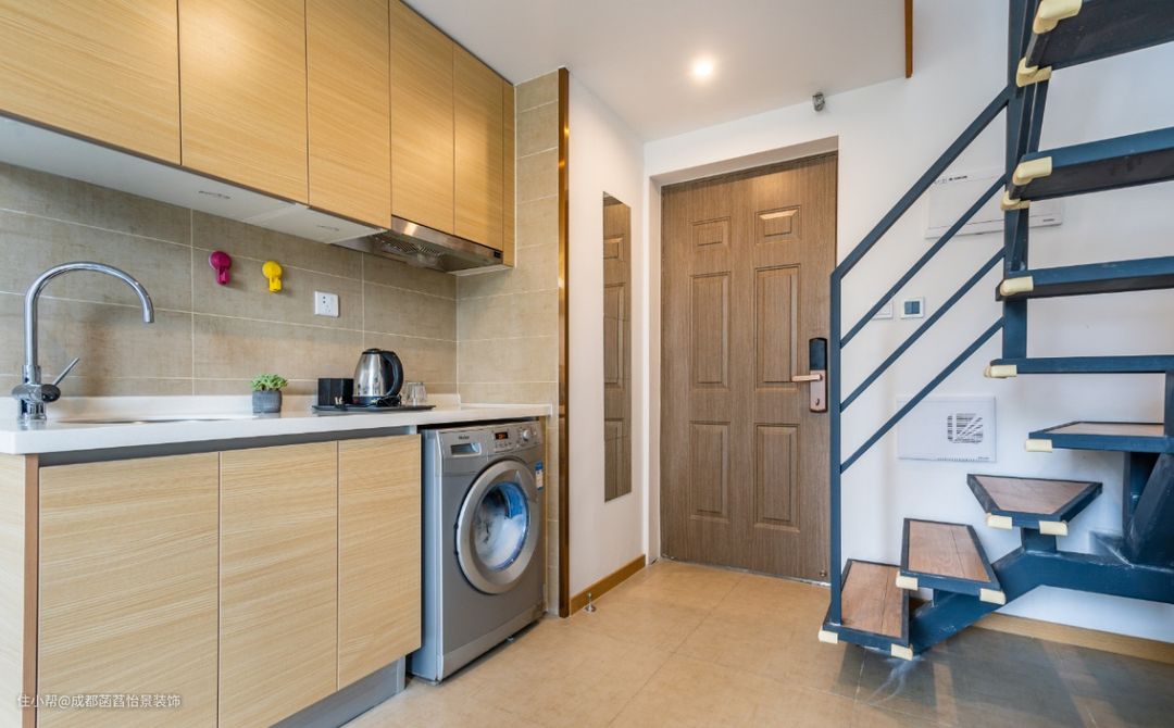 入户的空间做了一个简单的厨房设计,将洗衣机也嵌入其中,保障空间使用的流畅性。