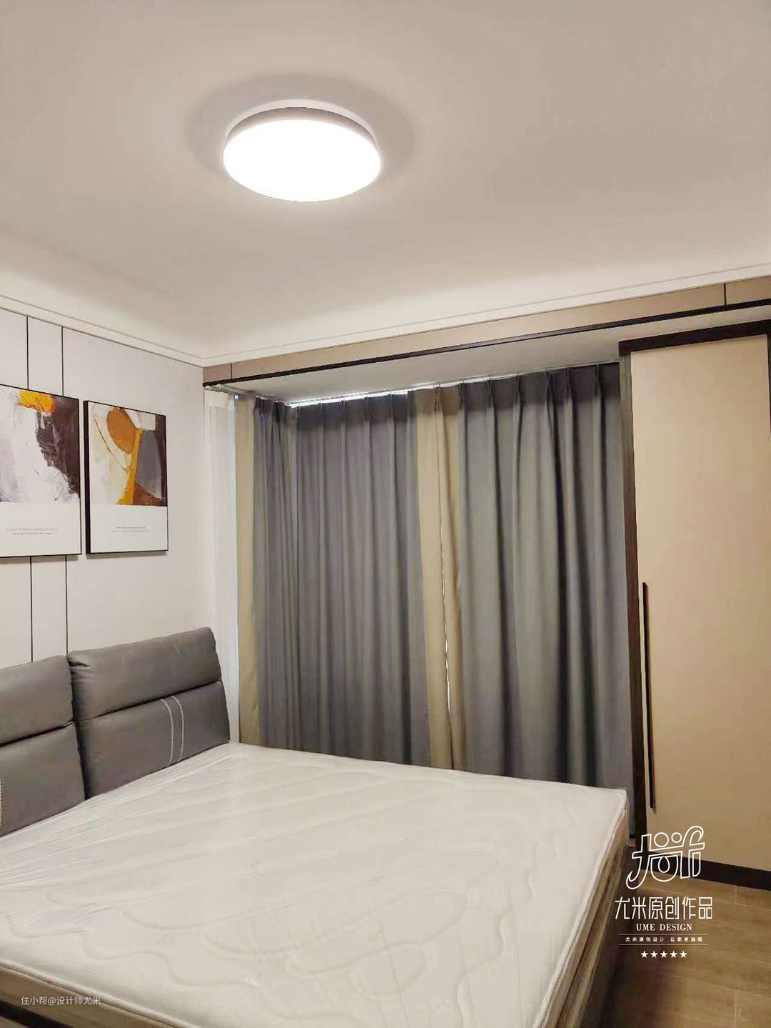 由于疫情影响,部分家具在成都未能及时发货,导致床头柜未及时到货。 衣柜采用的是1字型拉手,与床头背景的线条是相呼应的。 柜门采用一门到顶,床头柜位置的门分了两截做,下面放床头柜后固定不开,上面可正常开启。