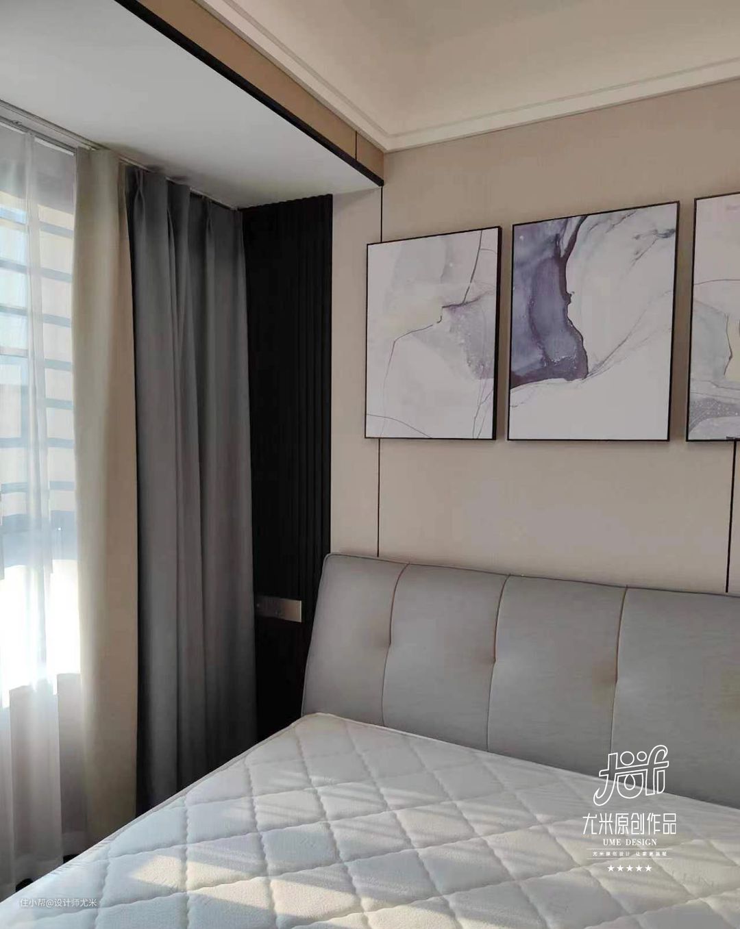 床头背景加了木格栅,三根0.8厘米的黑色铝合金条,增强了床头背景的线条感。