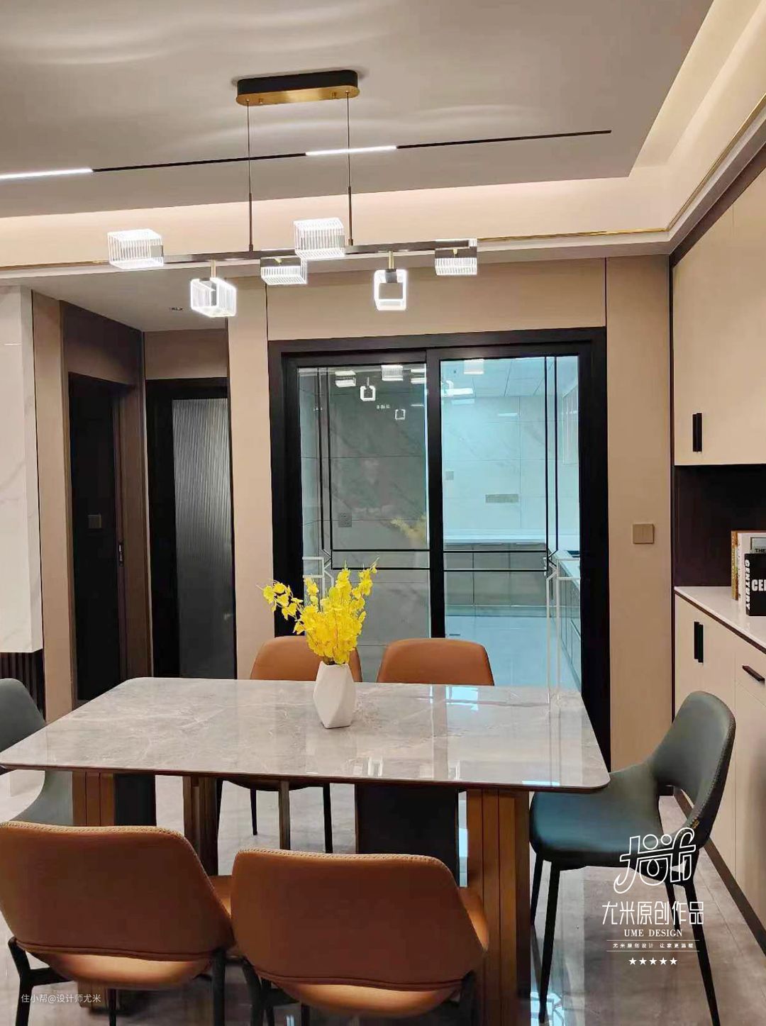 餐桌桌面使用的是岩板材质,桌腿是金色不锈钢金属材质。物主长期在外地工作,平时只有父母和两个小孩,用的长方形餐桌更方便使用,也更有现代感。 餐桌尺寸:1.6米X0.8米,材质:橡木加不锈钢材质。 餐吊灯尺寸:1.2米长,材质:铝合金加有机玻璃。