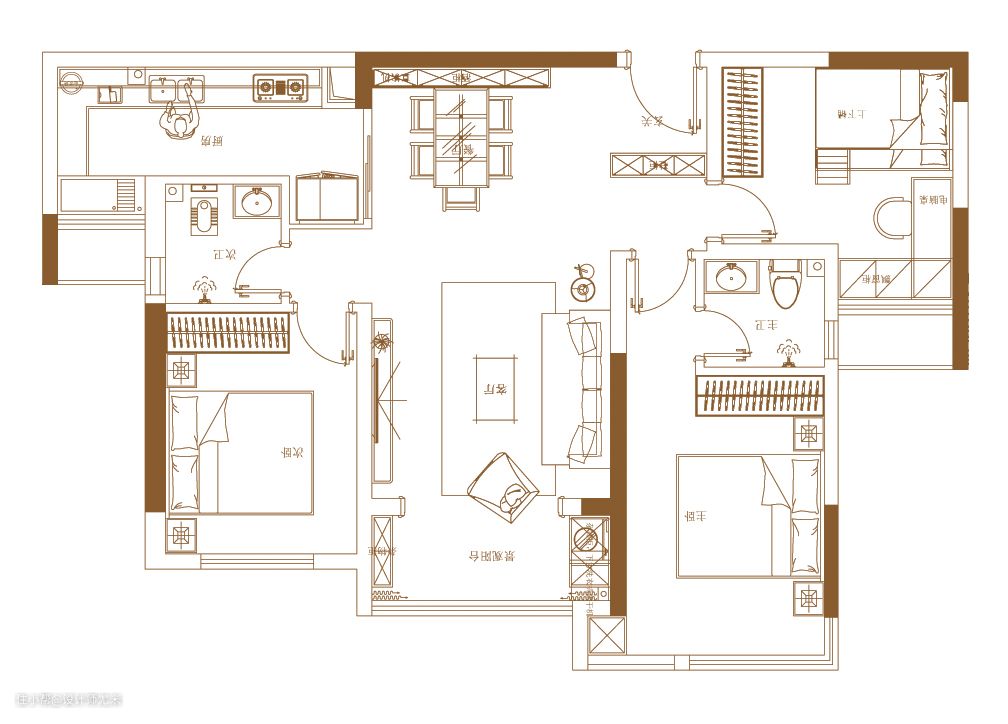 解决方案: ○ 将入户玄关处墙面全部拆除,后期直接做鞋柜当墙,做入户玄关。 ○ 把原来厨房单门改成双推滑门,扩大厨房门洞,把客厅光线导入厨房,解决光线暗的问题。 ○ 把生活阳台拆除改成厨房空间,扩大厨房操作台面,两三个人同时操作都没问题。 ○ 把次卫原来规划放浴室柜的位置拆除,把墙往次卧方向移,给厨房留冰箱位置。 ○ 全房做中央空调,保留一个空调位,把多余空调位拆除做收纳空间。 ○ 把飘窗全部拆除,扩大卧室空间。 ○ 拆除原始客厅推拉门,断桥铝封阳台,将晾晒区改到休闲阳台。 ○ 由于晾晒在休闲阳台,帮客户预留了独立的洗衣机,烘干机位置。后期大件衣物通过烘干机解决,小衣物用智能晾衣架晾晒,这样解决全部衣服挂在休闲阳台的尴尬。