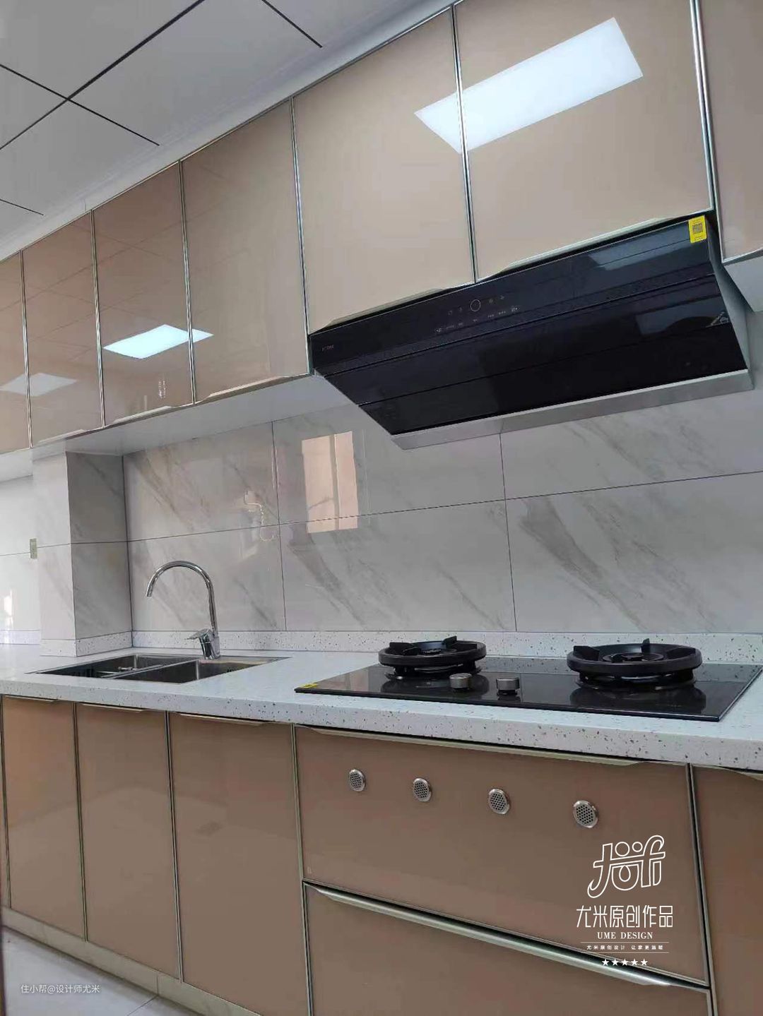 厨房是油烟比较重的地方,在材质使用上面一定要考虑易打理清洁的材质。 厨房本身光线偏暗,所以墙面瓷砖选择爵士白亮面砖,铝扣板吊顶使用黑框亮面材质,橱柜门使用高光金刚门材质。