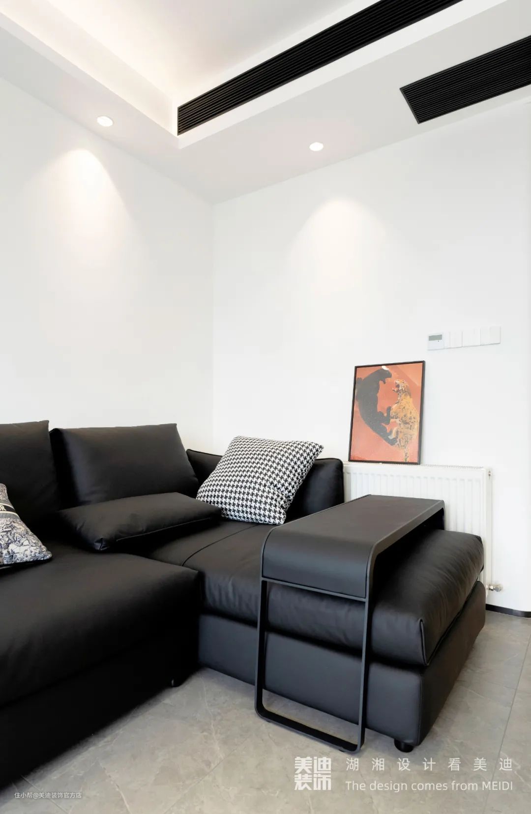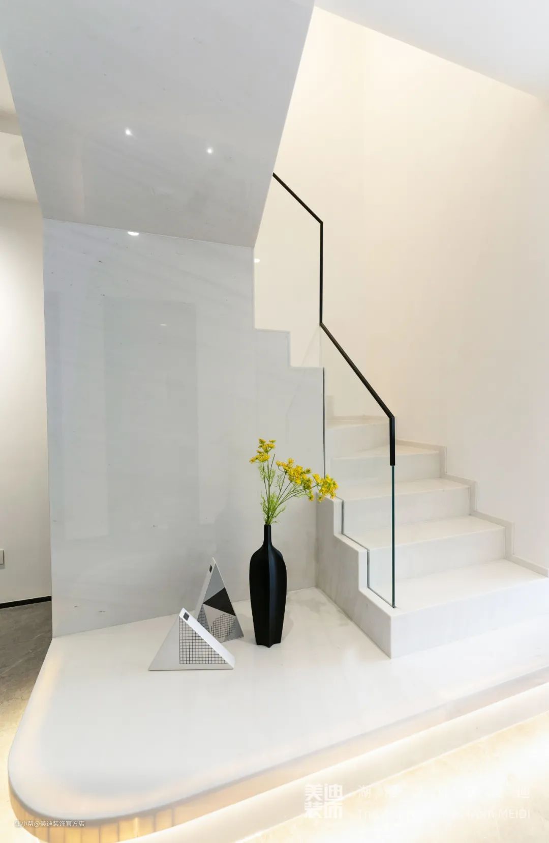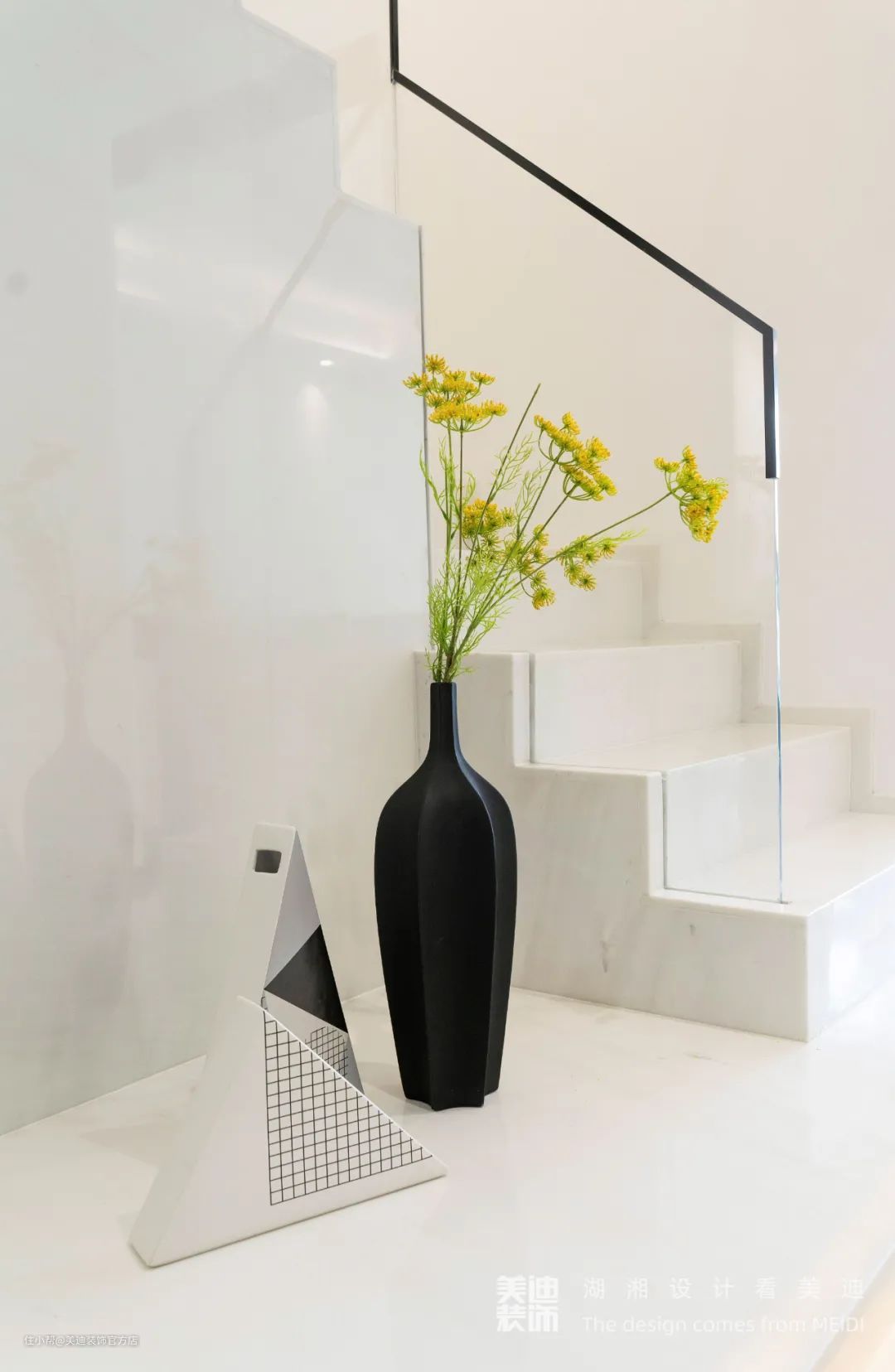楼梯扶手是由超白玻璃以及极窄的黑色包边组成,在视觉上形成冲突强烈的线条感,使得空间延展性更好,而全屋的摆件,都是以磨砂质感的黑色、或是黑色网格及波点元素组成,明暗交织之间,让空间氛围感更浓郁。
