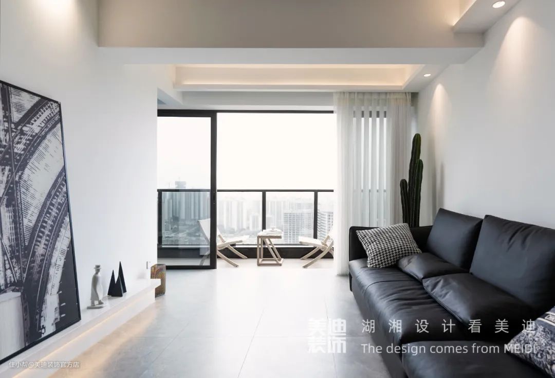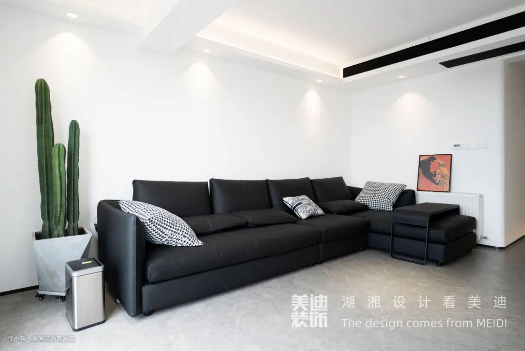 客厅浅灰色的大理石瓷砖铺贴,以及绿色的仙人掌盆栽,石与木的元素加入,让空间不至于冷酷,交流感更强。