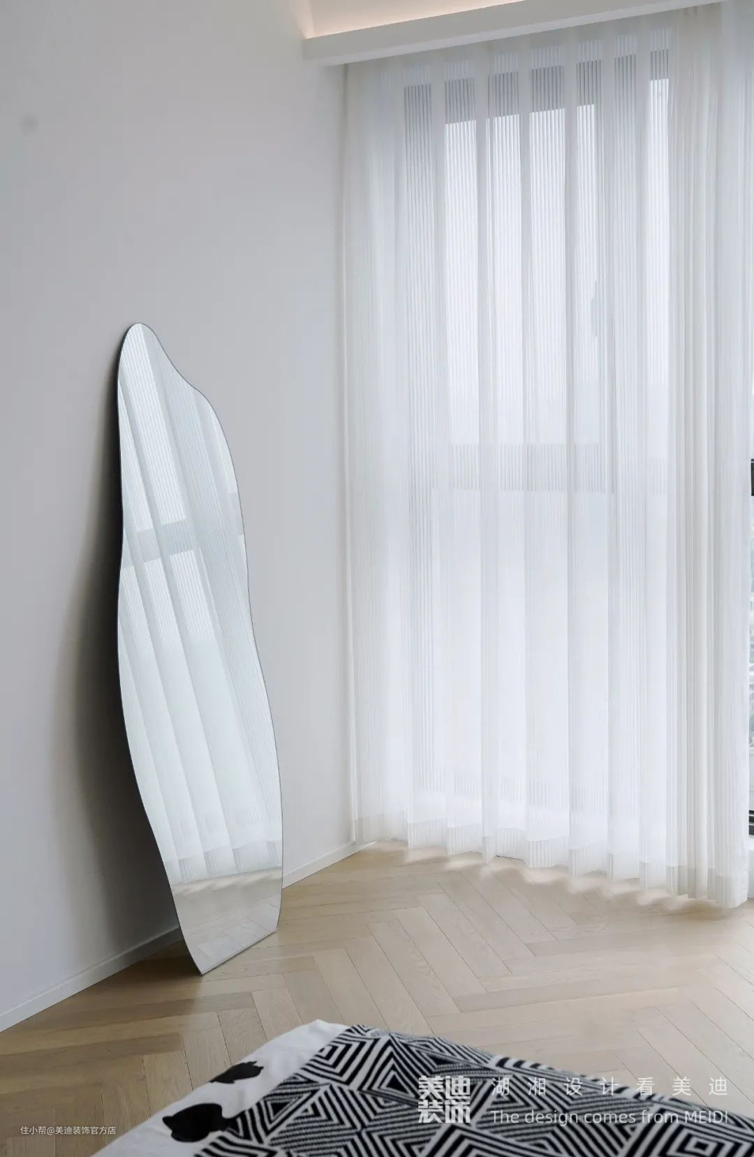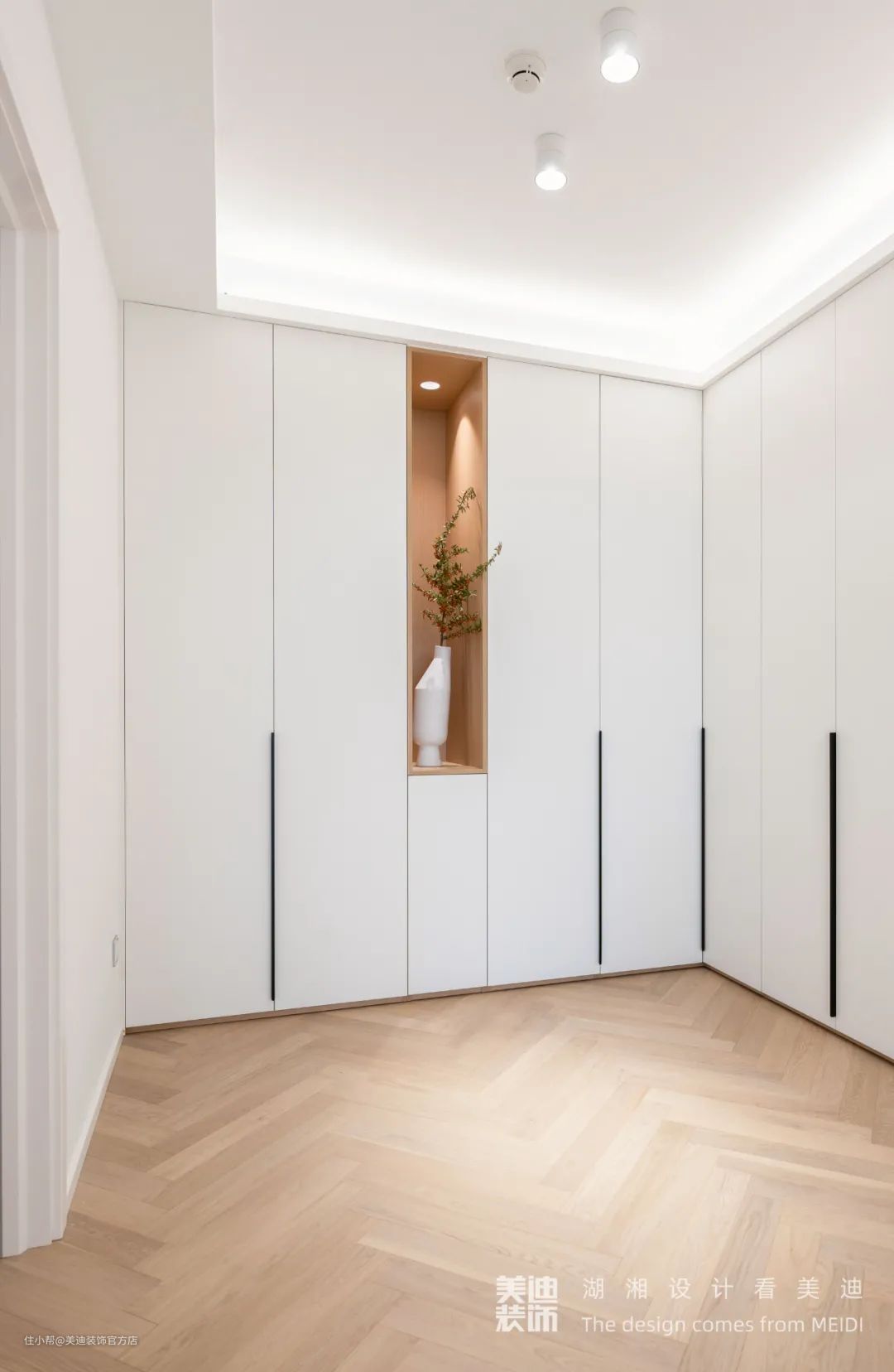在卧室及衣帽间地板采用的是鱼骨纹浅色木地板,这样的纹理使得空间更有层次感,在整版纯色的衣柜中,设置了一个陈列区域,让空间变得更有重点。