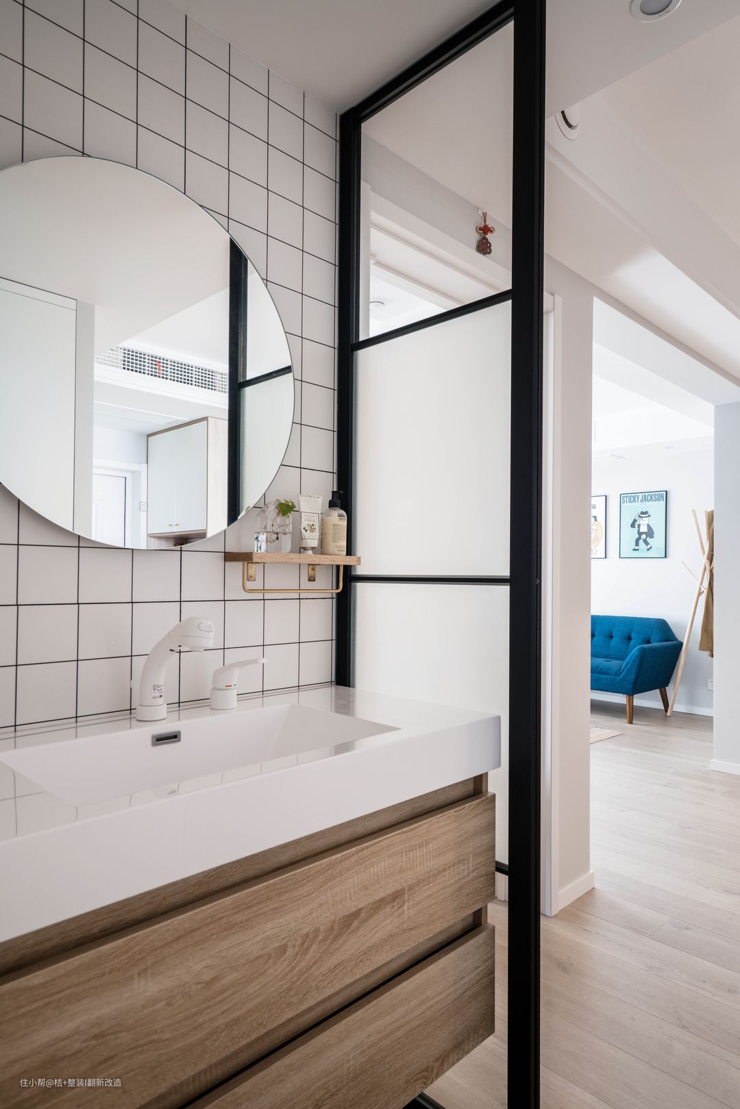 洗手区墙面采用黑边白色格子砖,白色面积多,会让空间显得更大,黑白搭配简单又大方。