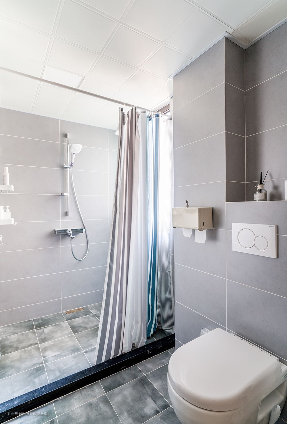 灰色的墙砖简约大气,铝扣板吊灯防水好打理。地砖是很个性的灰色渐变地砖,不显脏。利用墙体做了壁龛,可以陈列也可以收纳,挺实用。 墙体上置物盒放卫生纸,方便顺手。拉开浴室帘就是洗浴区。