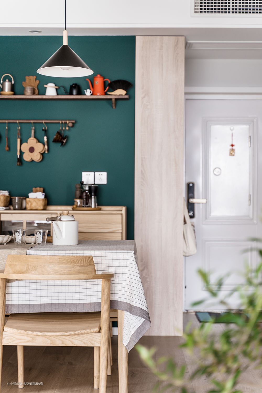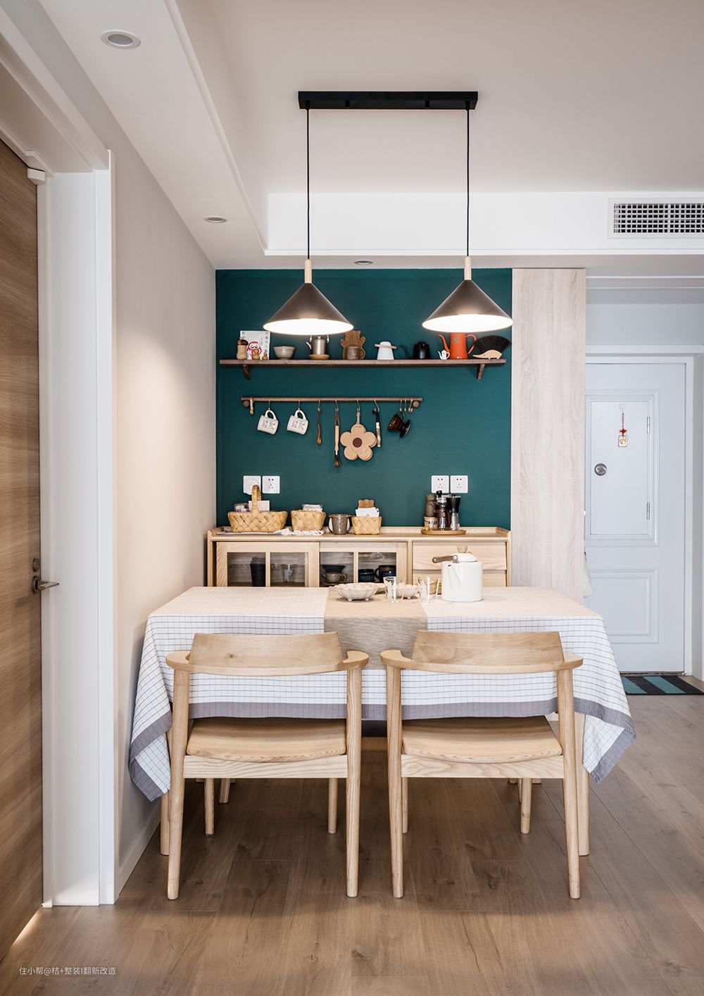餐厅墨绿色墙漆搭配原木色矮餐边柜,ins复古冷调元素与日式元素完美融合,既复古又清新干净~餐灯是黑色金色搭配原木色细节即和整体色调呼应,又让空间多了一份时尚感。本来业主想要玻璃,但是玻璃少了份温馨感,灯泡一定要暖光,开灯之后氛围拉满。