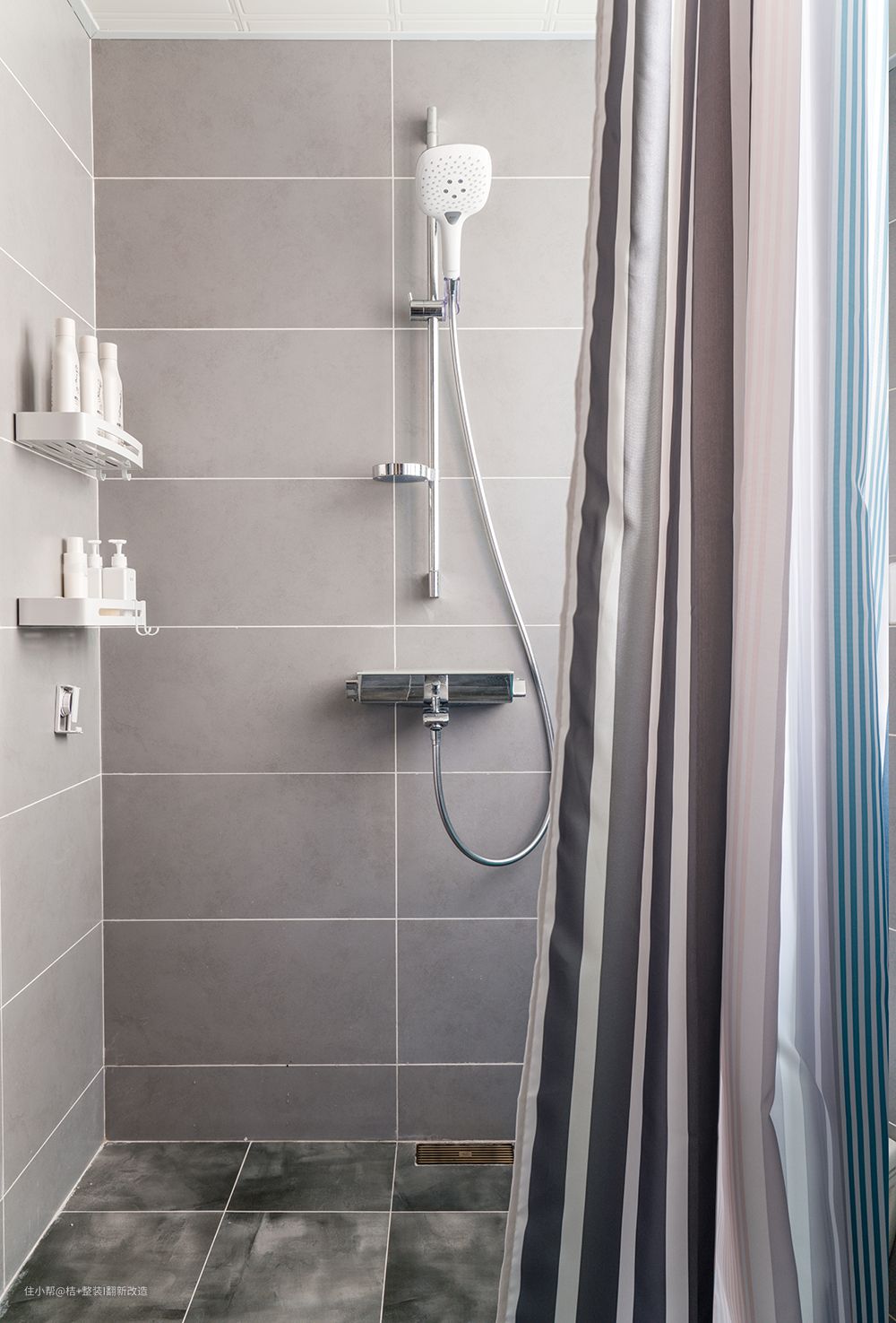 淋浴区是原本厨房内的阳台,改造后成淋浴区后保留了窗户采光。置物架上墙,洗浴用品放在这随手取用,很方便。浴帘隐私性高,卫生间内两个区域可以同时使用,提高了卫生间的使用效率。