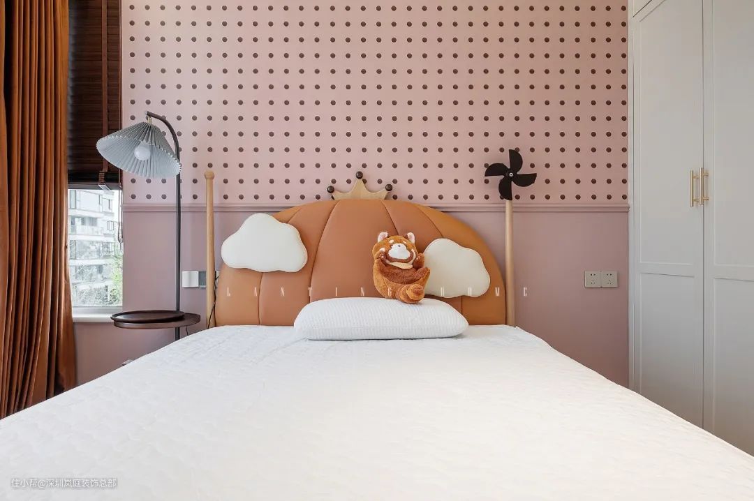 儿童房设计是以粉色为主的,延续主卧的洞洞板+护墙板的设计,利用粉色的温馨浪漫给孩子一个快乐的童年。