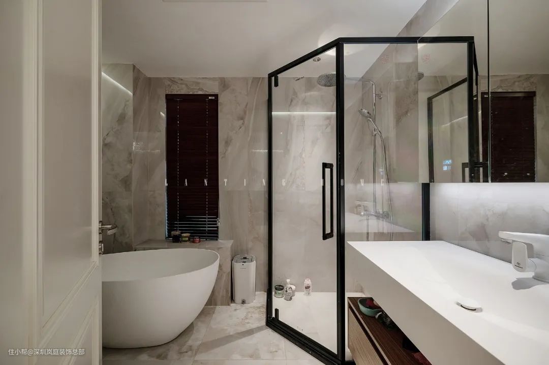 在卫生间做干湿分离设计,业主有安装浴缸的需求,为了保证空间的动线布局,在淋浴区的设计上选择了钻石型转角,有效节省空间,还能保证干湿分离。